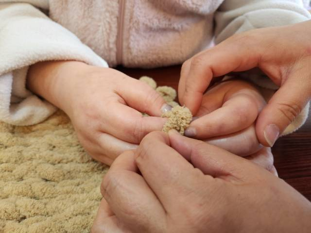 커피를 마시고 나니 아까와 다르다. 하품은 하지만, 고리를 끼우는 손길이 달라졌다. 선생님이 어떤 고리에 넣을지 알려주시면 김민정 씨가 끼운다. 실이 부드러워 손에서 미끄러지지만 포기하지 않는다. 거듭 끼울수록 요령을 찾아가는 게 신기하다. 선생님도 그렇게 느끼셨는지 “민정 씨, 하면 할수록 느네요.”라고 하셨다.