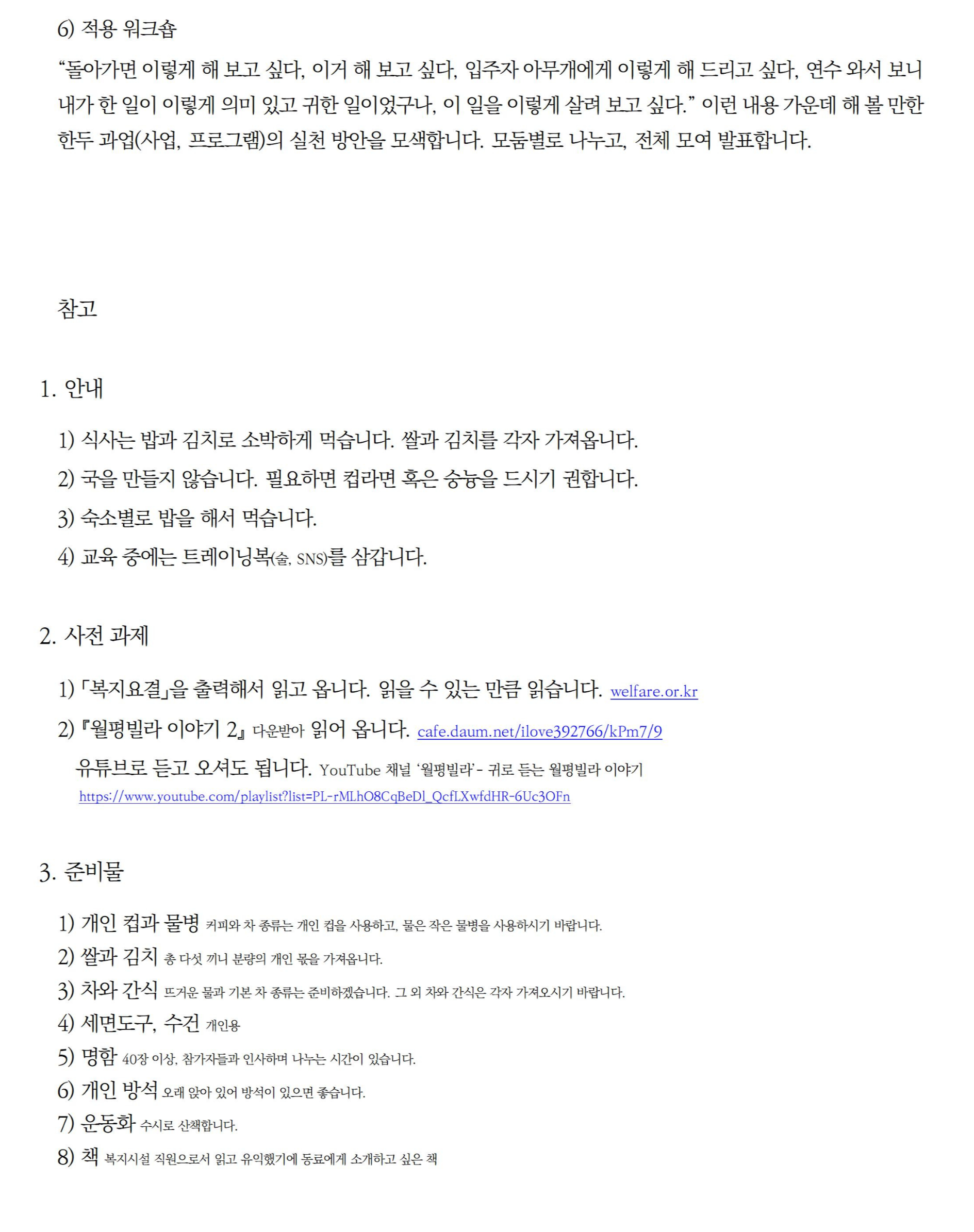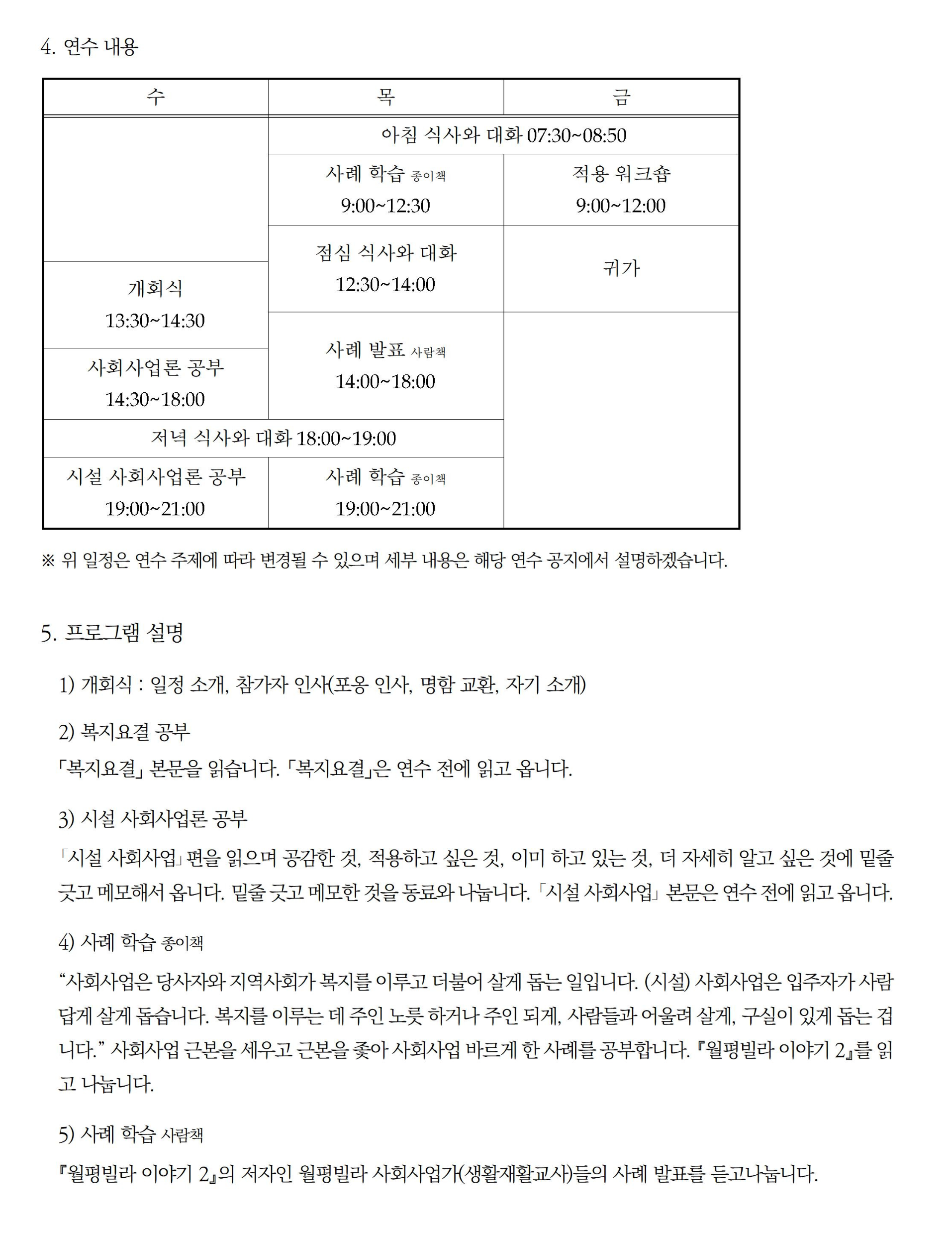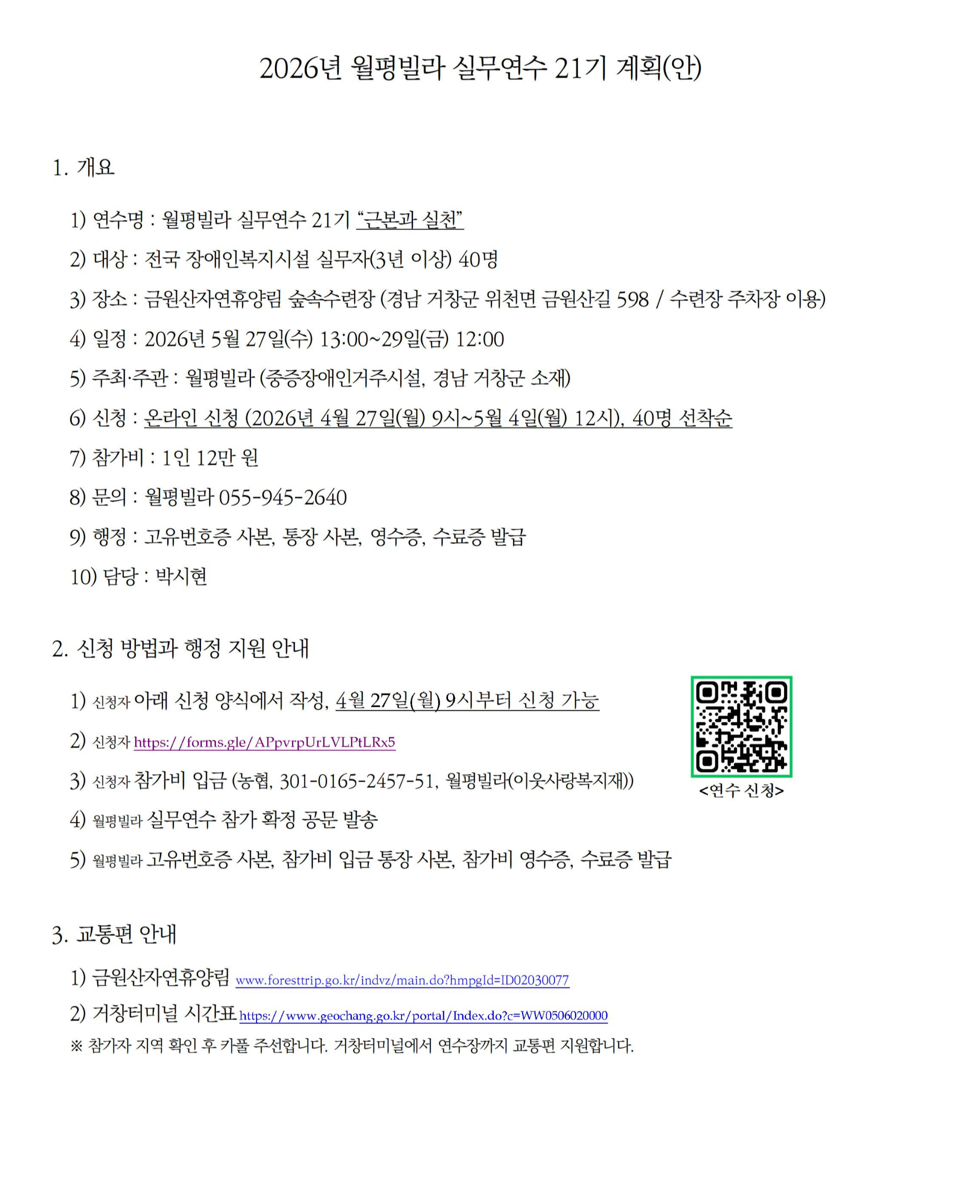 2026년 월평빌라 실무연수 21기 모집 안내 작성자월평빌라.|작성시간26.04.21|조회수84 목록 댓글 0 글자크기 작게가 글자크기 크게가 실무연수 21기 신청2026년 월평빌라 실무연수 21기_사회사업 근본과 실천 신청하기 * 2026. 4. 27.(월) 9시부터 신청할 수 있습니다. (공문) 2026년 월평빌라 실무연수 21기 모집 안내.pdf203.56KB 첨부파일첨부된 파일이 5개 있습니다. jpg 파일 실무연수 21기 신청QR.jpg 다운로드 jpg 파일 사본-월평26-057(발송) 2026년 월평빌라 실무연수 21기 모집 안내003.jpg 다운로드 jpg 파일 사본-월평26-057(발송) 2026년 월평빌라 실무연수 21기 모집 안내004.jpg 다운로드 jpg 파일 사본-사본-월평26-057(발송) 2026년 월평빌라 실무연수 21기 모집 안내005.jpg 다운로드 pdf 파일 (공문) 2026년 월평빌라 실무연수 21기 모집 안내.pdf 다운로드 다음검색 현재 게시글 추가 기능 열기 북마크 신고 센터로 신고 댓글 댓글 0 댓글쓰기 답글쓰기 댓글 리스트