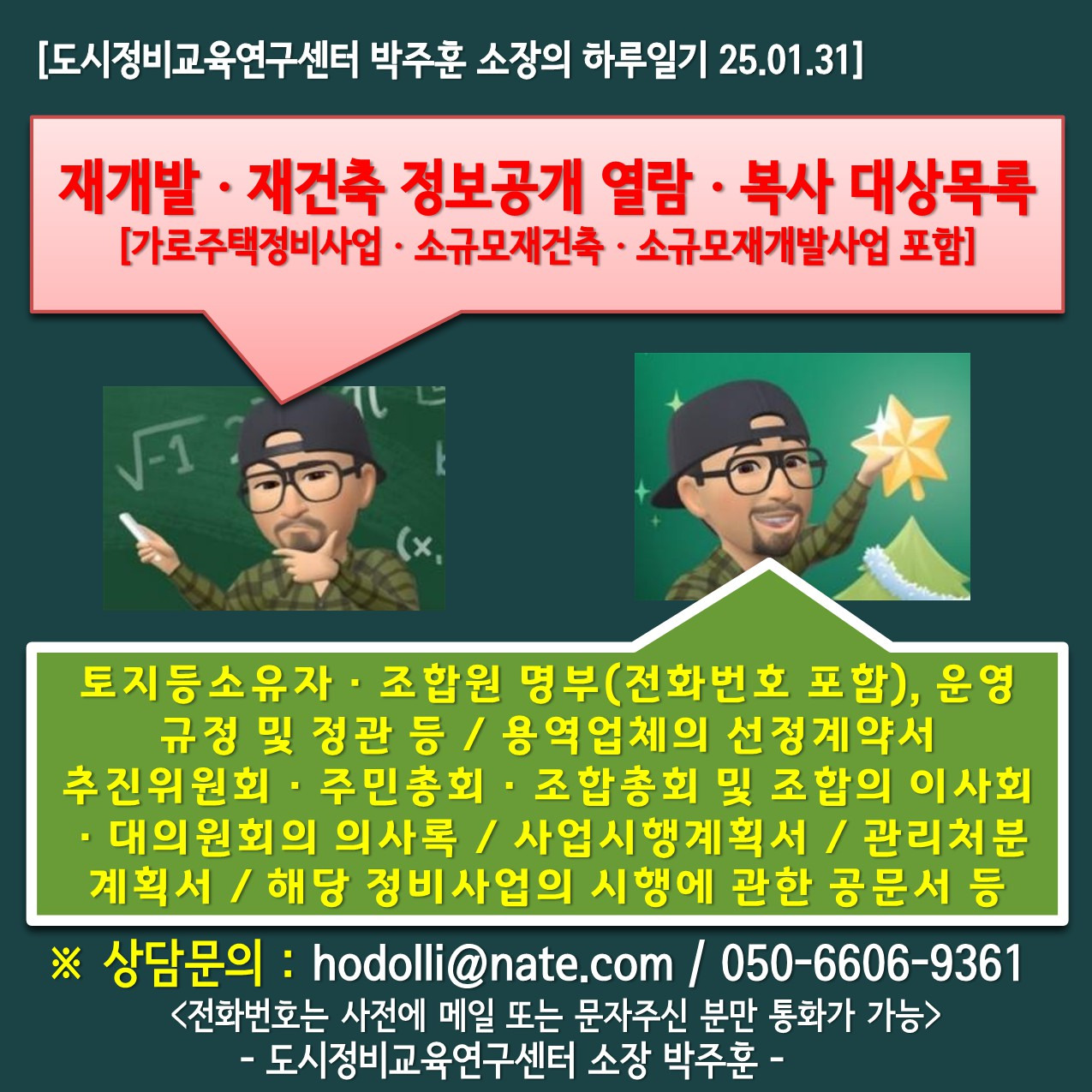 #도시정비교육연구센터 #박주훈소장 #재개발척척박사 #하루일기 #재개발 #재건축 #도시정비사업 #소규모재건축 #가로주택정비사업 #재개발정보 #재건축정보 #조합원 #토지소유자 #추진위원회 #주민총회 #조합총회 #사업시행계획서 #관리처분계획서 #공문서 #정보공개 #부동산투자 #부동산정책 #도시재생 #부동산정보 #카카오톡채널