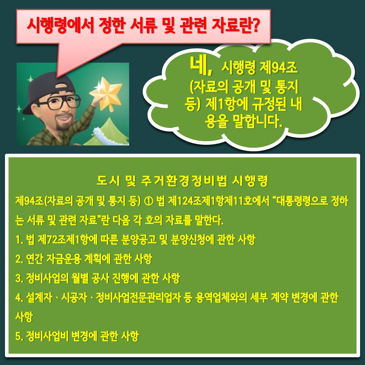 토지등소유자ㆍ조합원 명부(전화번호 포함), 운영규정 및 정관 등 / 용역업체의 선정계약서 / 추진위원회ㆍ주민총회ㆍ조합총회 및 조합의 이사회ㆍ대의원회의 의사록 / 사업시행계획서 / 관리처분계획서 / 해당 정비사업의 시행에 관한 공문서 등. 알기 쉬운 정비사업배움