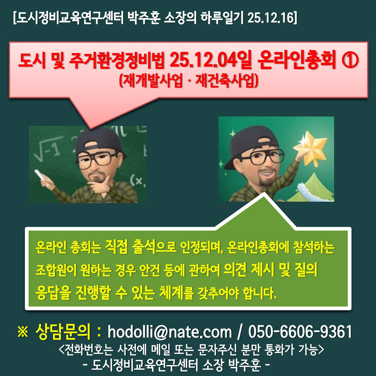 #도정법사랑모임 #도시정비교육연구센터 #박주훈소장 #재개발척척박사 #하루일기 #도시및주거환경정비법 #정비법개정 #25년정비법개정 #온라인총회 #온라인총회허용 #정비사업온라인총회 #재개발 #재건축 #재개발사업 #재건축사업 #정비사업 #정비조합 #조합총회 #직접출석인정 #총회의결 #조합원권리 #질의응답 #의견제시 #정비사업절차 #정비사업실무 #도시정비 #부동산정책 #정비사업교육