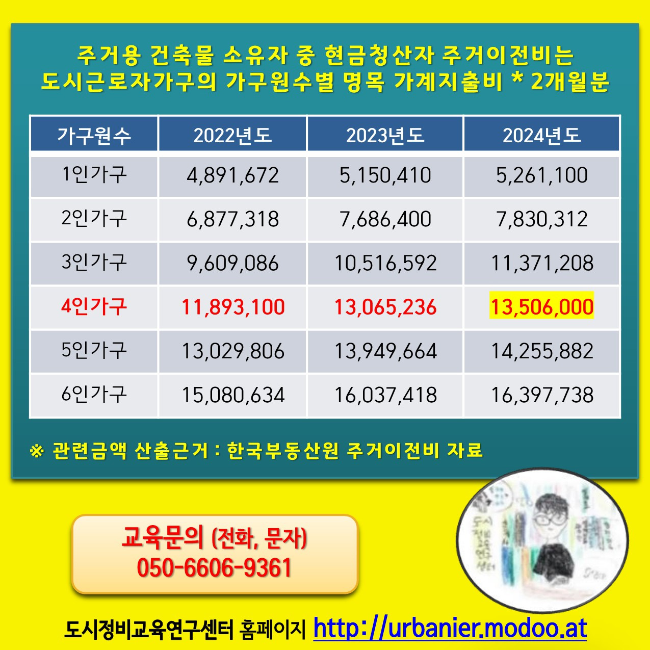 “정비구역지정 공람공고일 현재” 부터 보상협의계약 체결 또는 수용재결시 까지 거주하는 주거용건축물 소유자중 현금청산자 4인가족 기준으로 2024년도 지급금액은 “13,506,000원”입니다. 알기 쉬운 정비사업배움