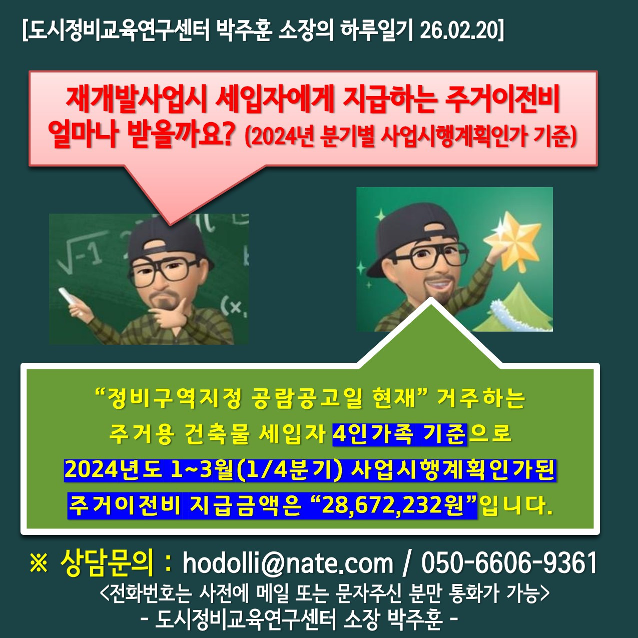 #도정법사랑모임 #도시정비교육연구센터 #박주훈소장 #재개발척척박사 #하루일기 #재개발 #재개발보상 #현금청산 #현금청산자 #주거이전비 #이주비 #정비사업 #도시정비사업 #사업시행계획인가 #보상협의계약 #수용재결 #토지보상 #공익사업보상 #정비구역 #정비구역지정 #4인가족기준 #2024년기준 #분기별보상금 #재개발정보 #부동산공부 #부동산상식 #재개발상담