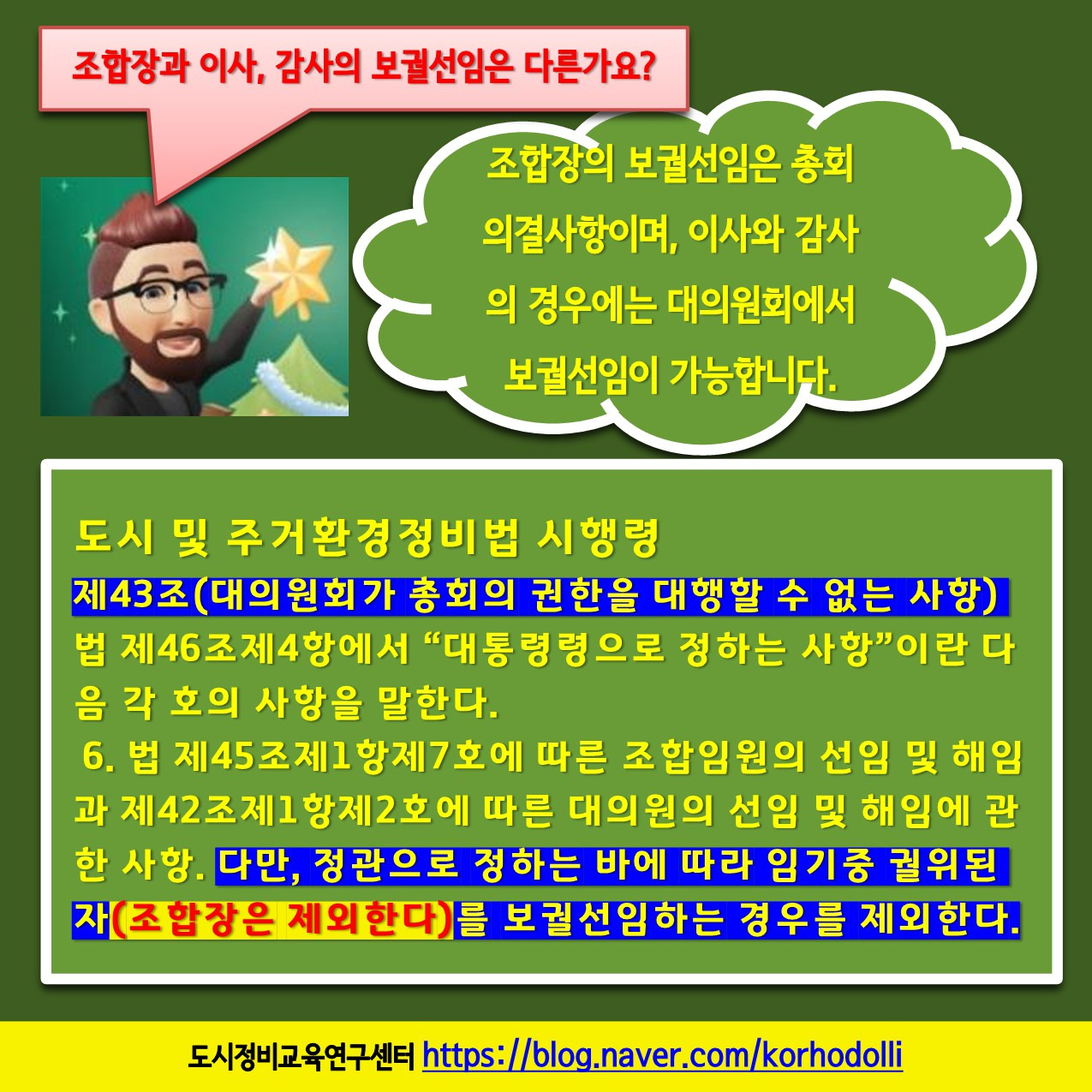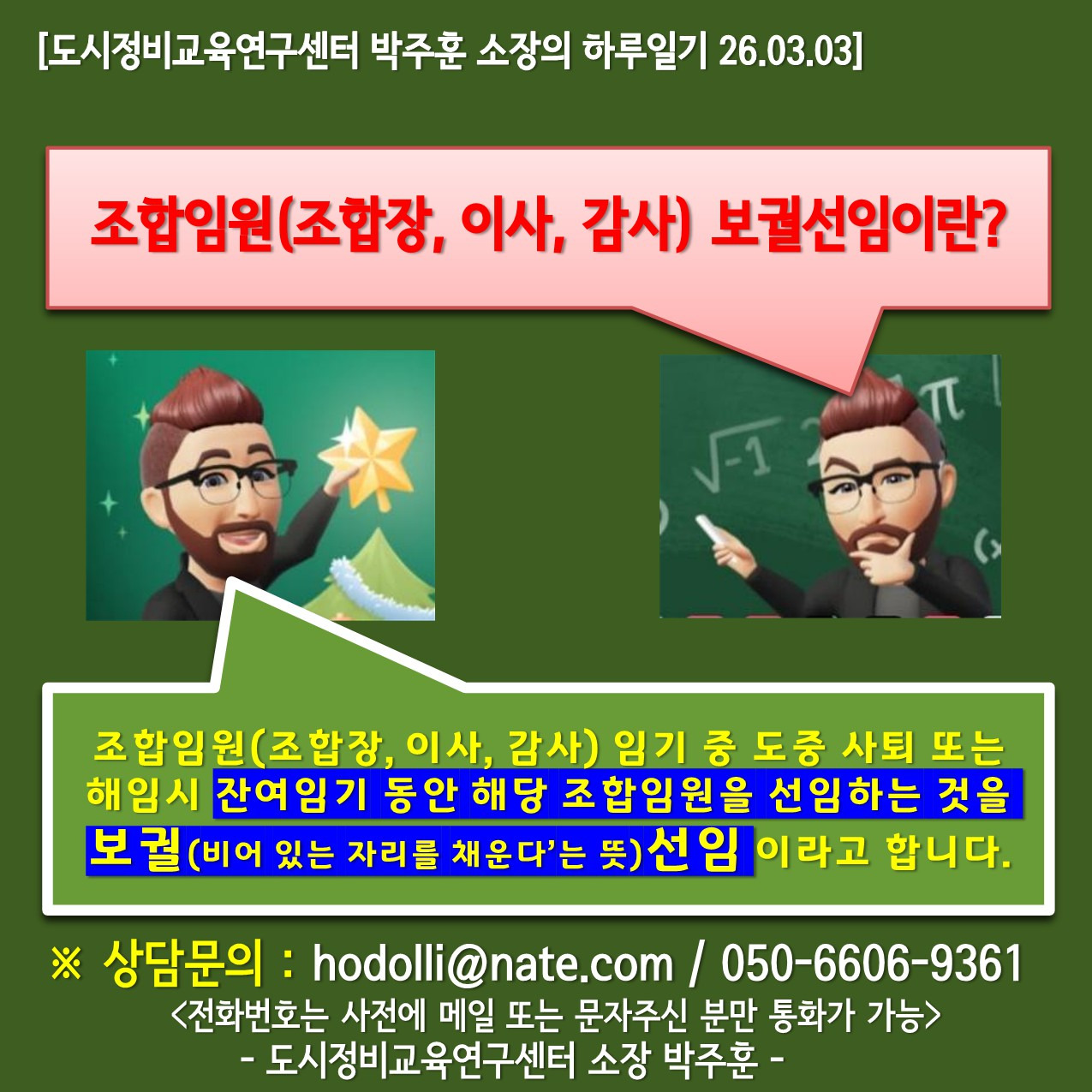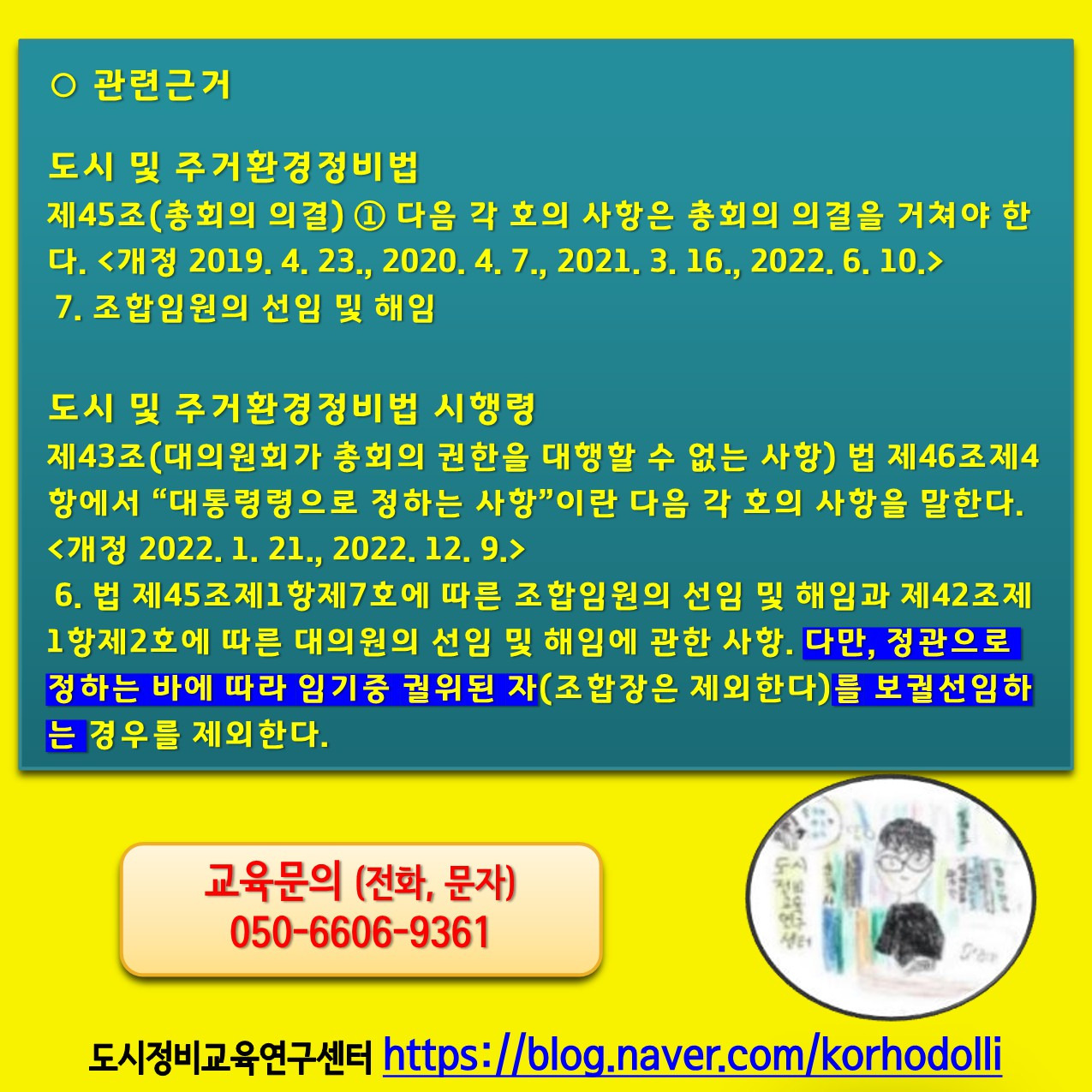 #도정법사랑모임 #도시정비교육연구센터 #박주훈소장 #재개발척척박사 #하루일기 #재개발 #정비사업 #도시정비 #조합임원 #조합장 #이사 #감사 #보궐선임 #잔여임기 #임기중사퇴 #임원해임 #조합총회 #총회의결 #정비사업법 #도시및주거환경정비법 #조합운영 #조합실무 #정비사업실무 #조합분쟁 #정관규정 #재개발법률 #정비사업교육