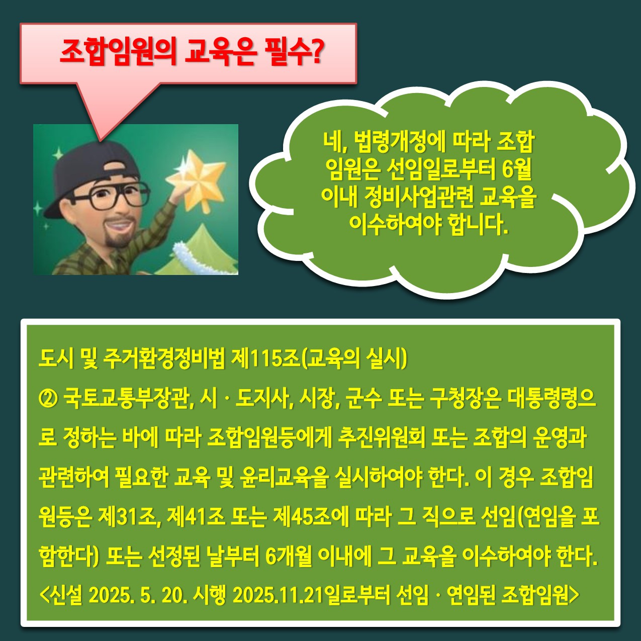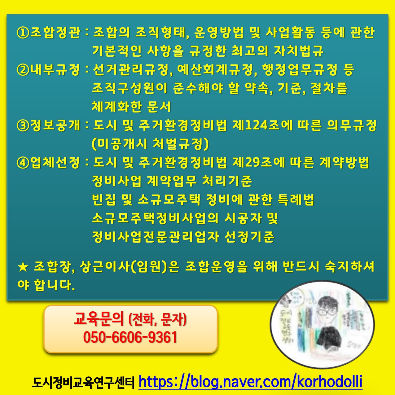 조합정관, 내부규정, 정보공개, 업체선정 절차는 반드시 교육을 통해 이수하시기 바랍니다. 알기 쉬운 정비사업배움