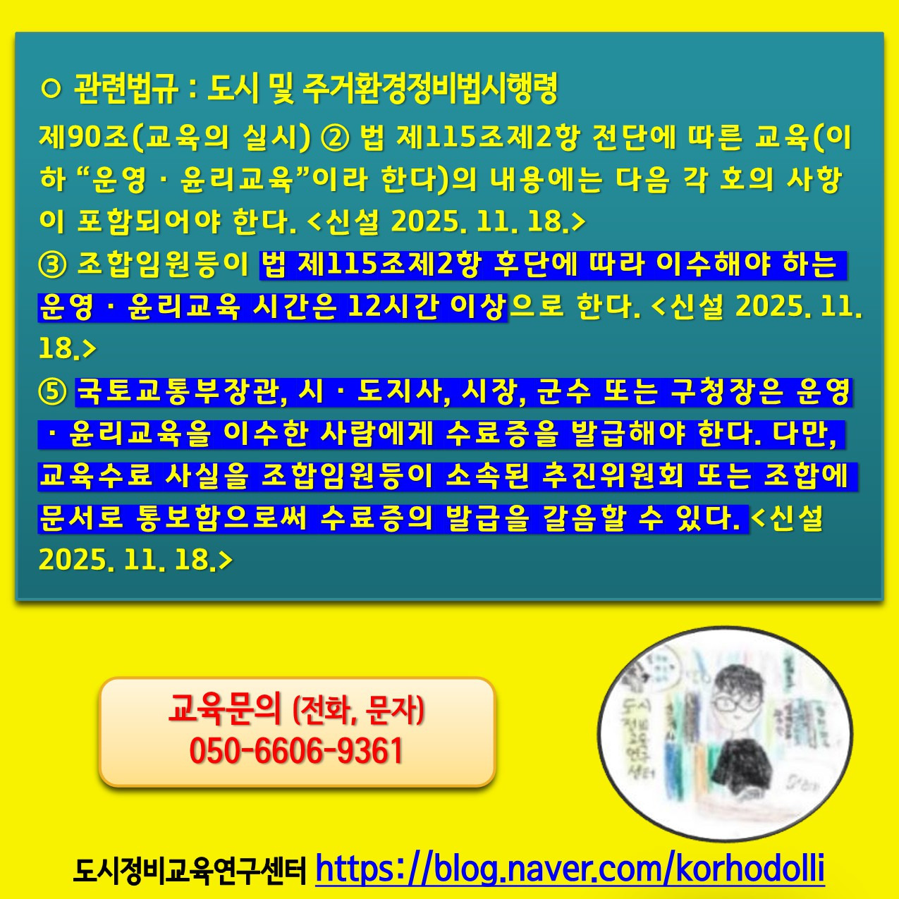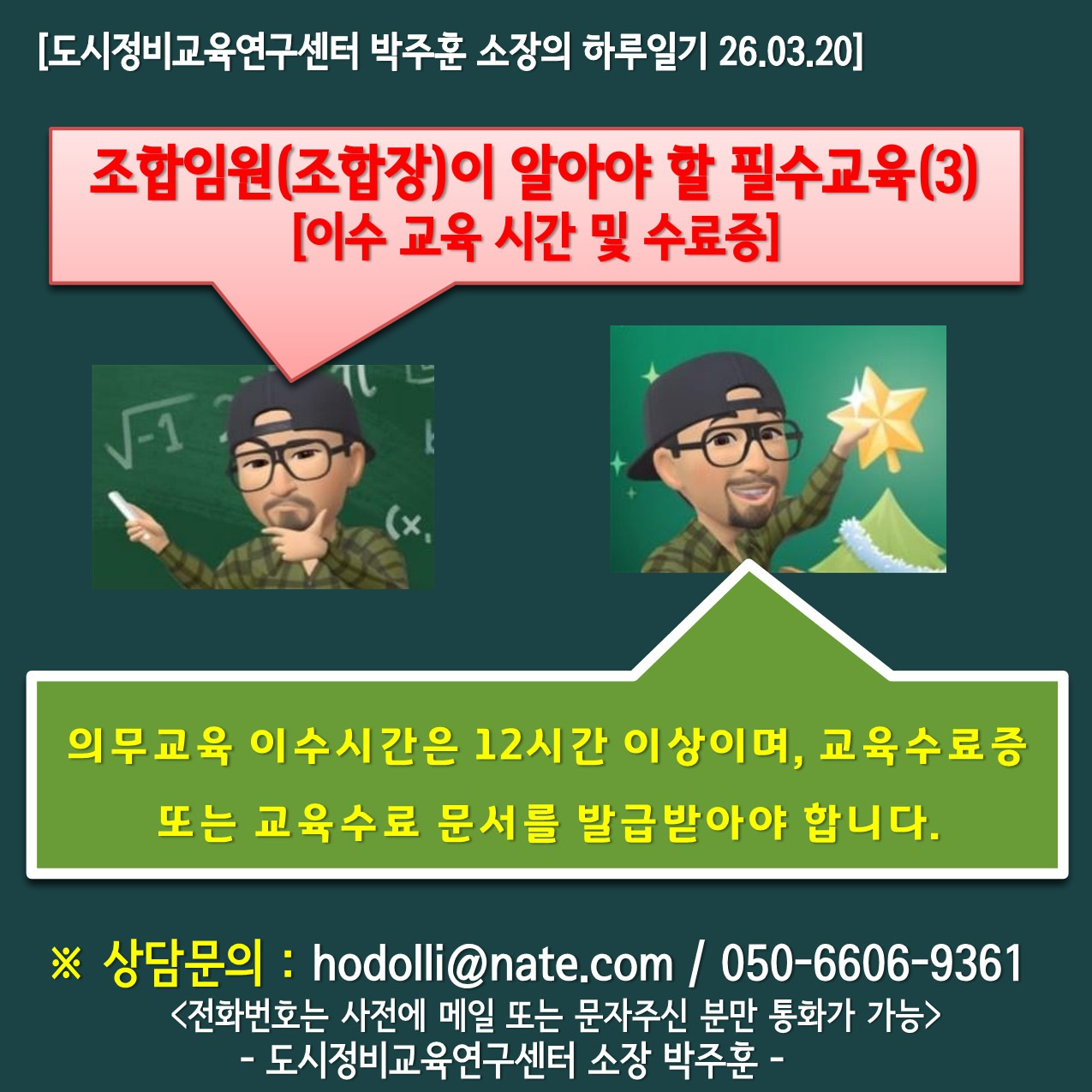 #정비사업정보 #재개발정보 #재건축정보 #도시정비법 #조합운영 #정비사업실무 #교육이수 #교육수료증 #조합임원의무교육 #도시정비연구 #조합장필수교육 #정비사업전문가