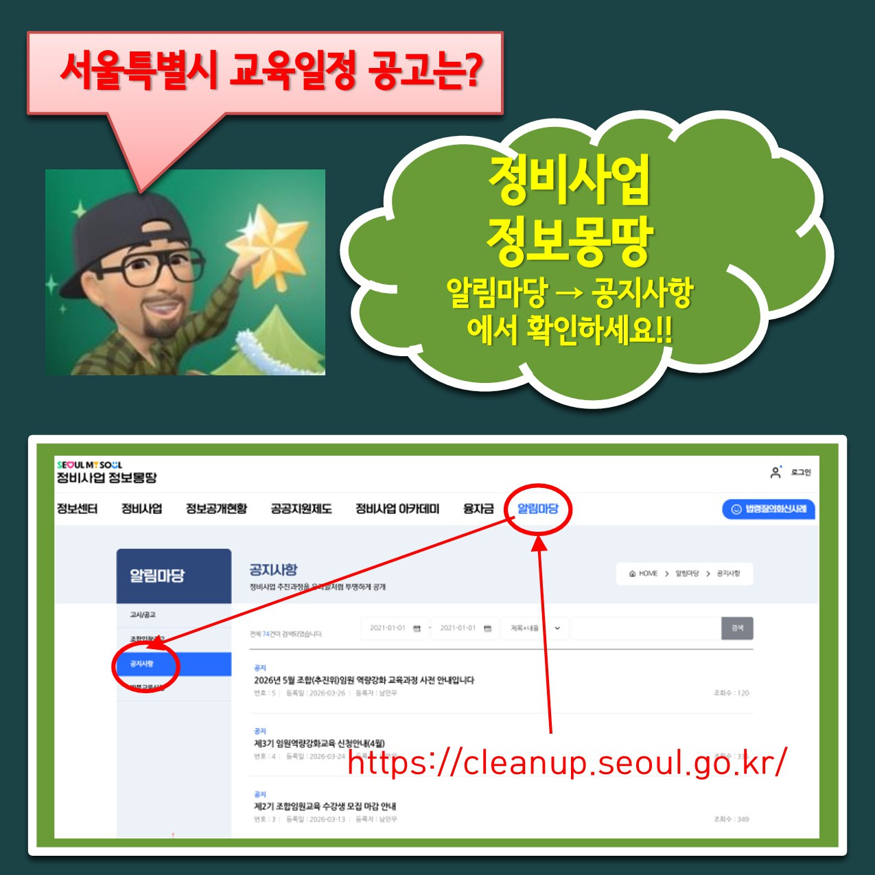 지방자치단체의 경우에는 서울특별시의 경우에는 매년 1기~4기(최대 5기)까지 기수별 교육을 서울시청 서소문청사 후생동 4층 대강당 에서 실시합니다. 알기 쉬운 정비사업배움