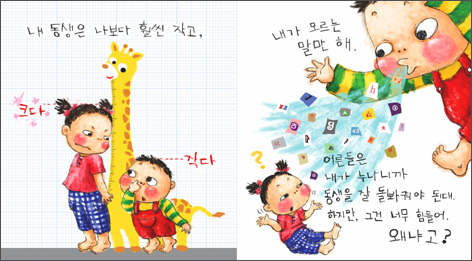 이 책의 특징은 유치원에 다니는 아이가 쓴 것처럼 삐뚤빼뚤한 손 글씨와 생생한 표정이 살아 있는 그림입니다. 특히 동생의 귀여운 행동을 떠올리는 장면은 동생을 미워하는 마음이 자기도 모르는 사이에 사라질 정도로 독자들의 공감대를 이끌어 내기에 부족함이 없습니다.