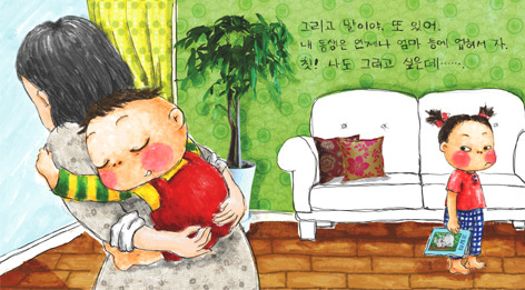 엄마가 어린 동생을 챙기다 보면 큰아이는 속상하게 마련이지요. 누나 입장에서는 동생이 얄미운 존재일 수밖에 없습니다. 그런 한편으로 귀엽기도 하고 사랑스럽기도 한 동생! 이 책은 자칫 그냥 지나치기 쉬운 누나의 상처받은 마음을 무겁지 않게 건드리면서도 동생과의 사랑 쟁탈 싸움이 미움으로 끝나지 않고, 동생의 귀엽고 사랑스러운 모습을 깨달아 가는 누나의 성장통 정도로 여겨지도록 마무리했습니다.