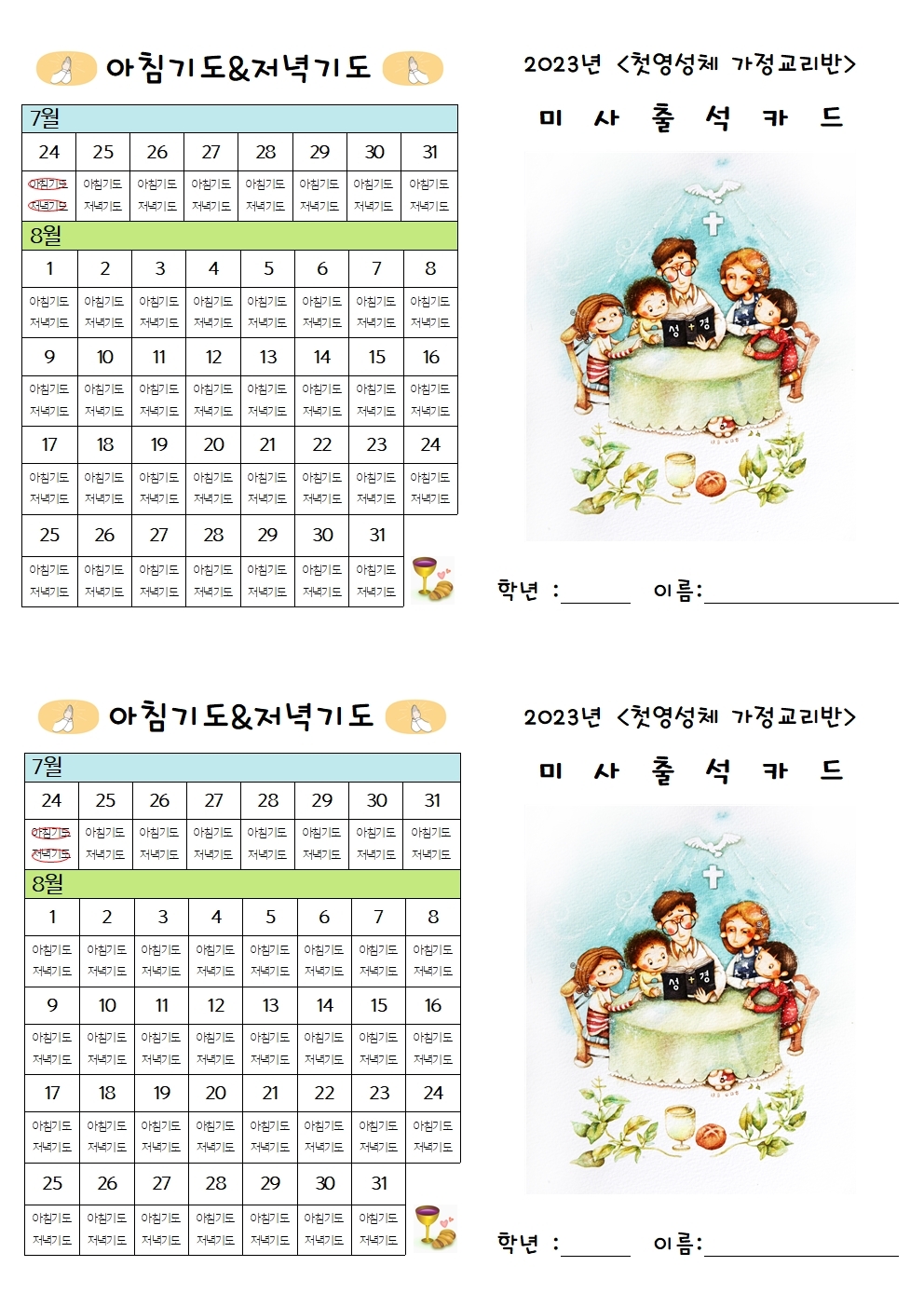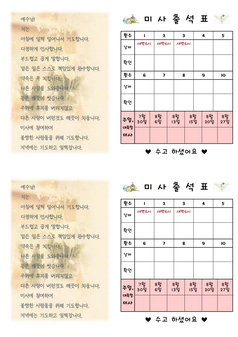 2023 여름방학 미사 출석카드 작성자김선영아녜스|작성시간23.12.14|조회수27 목록 댓글 0 글자크기 작게가 글자크기 크게가 2023년 방학 미사카드.hwp6.54MB 첨부파일첨부된 파일이 3개 있습니다. jpg 파일 2023년 방학 미사카드001.jpg 다운로드 jpg 파일 2023년 방학 미사카드002.jpg 다운로드 hwp 파일 2023년 방학 미사카드.hwp 다운로드 다음검색 현재 게시글 추가 기능 열기 북마크 공유하기 신고 센터로 신고 댓글 댓글 0 댓글쓰기 답글쓰기 댓글 리스트