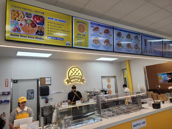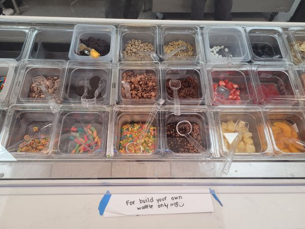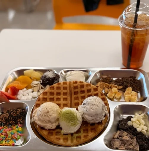 셀프 서비스로 와플 종류를 고르고 식판에 원하는대로 커스텀화 해 내 입맛에 맞게 선택할 수 있다.