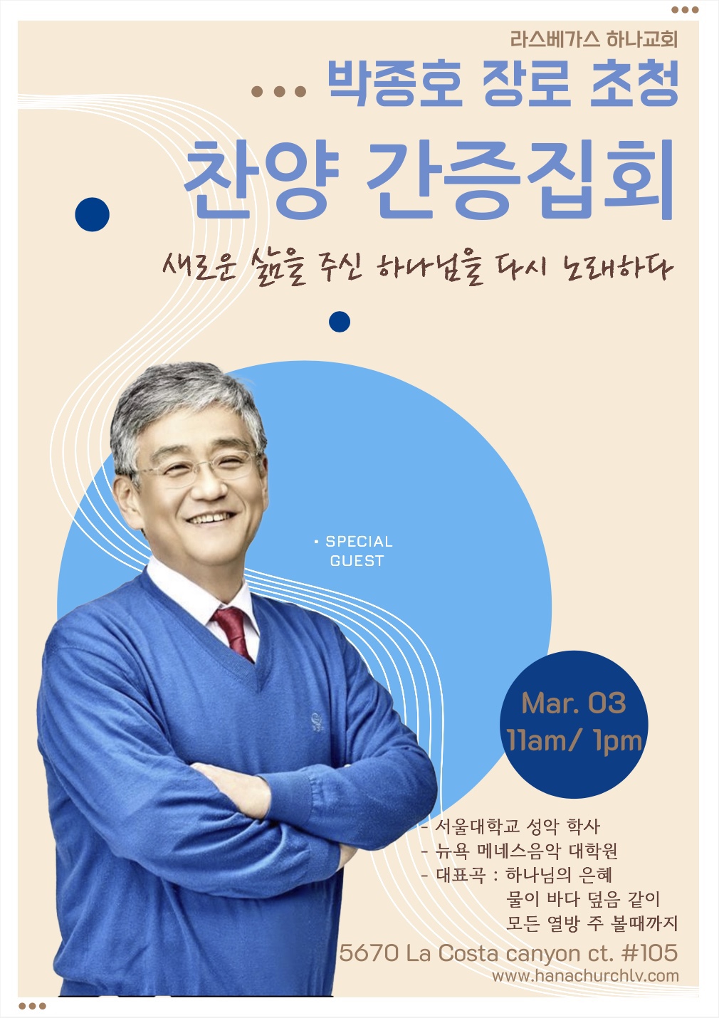 이번 주일(3월3일)에 하나교회에서 박종호 장로 찬양 간증 집회가 진행됩니다!