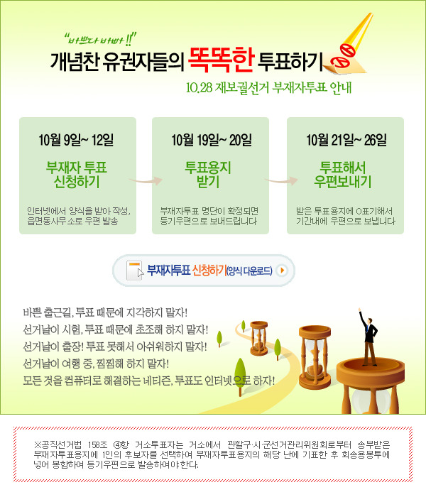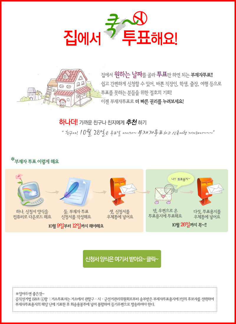 초간단 부재자 투표 방법(IQ별 이해하기-IQ150-100-70) 작성자가야지|작성시간09.10.06|조회수23 목록 댓글 0 글자크기 작게가 글자크기 크게가 부재자신고서식(재선거).hwp 첨부파일첨부된 파일이 4개 있습니다. jpg 파일 부재자투표홍보안1.jpg 다운로드 jpg 파일 부재자투표홍보안2.jpg 다운로드 jpg 파일 무제-1 복사.jpg 다운로드 hwp 파일 부재자신고서식(재선거).hwp 다운로드 다음검색 현재 게시글 추가 기능 열기 북마크 공유하기 신고 센터로 신고 댓글 댓글 0 댓글쓰기 답글쓰기 댓글 리스트
