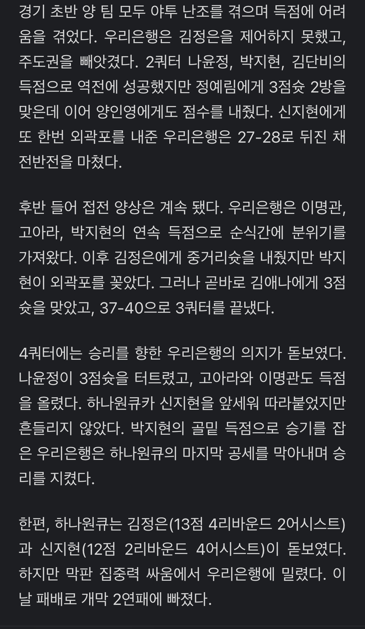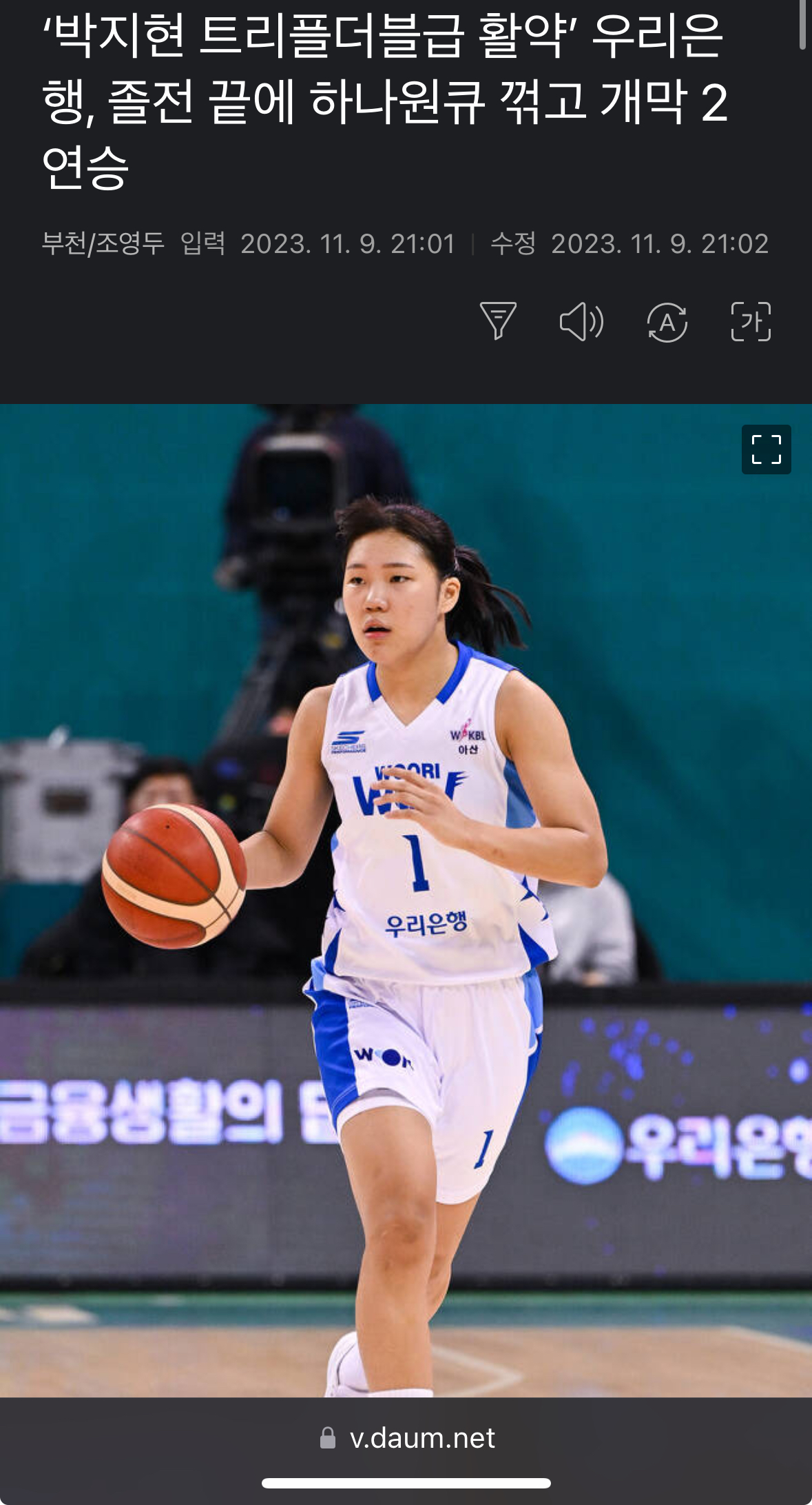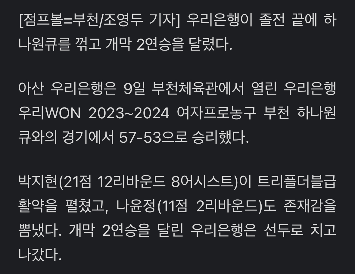 "박지현 트리플더블급 활약' 우리은행, 하나원큐 꺾고 개막 2연승 작성자버거킹매니아|작성시간23.11.09|조회수714 목록 댓글 2 글자크기 작게가 글자크기 크게가 https://v.daum.net/v/20231109210140076 다음검색 현재 게시글 추가 기능 열기 북마크 공유하기 신고 센터로 신고 댓글 댓글 2 댓글쓰기 답글쓰기 댓글 리스트 작성자김꾼대 | 작성시간 23.11.09 와 하뱅 그래도 김정은 합류하고 나쁘지 않은가봐요? 삼생한테도 아깝게 졌던데 작성자폭주 | 작성시간 23.11.10 박지현 캐리로 겨우 이기긴했는데김단비가 아무것도 안되는 날이였죠하나원큐는 조직력 부분은 좋아졌는데 경기 이기는 방법을 모르는거같아요어찌어찌하는데 결국 경기는 짐.. 댓글 전체보기