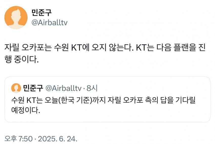 자릴 오카포 선수는 끝내 수원KT 영입이 불발되었다는 소식입니다.