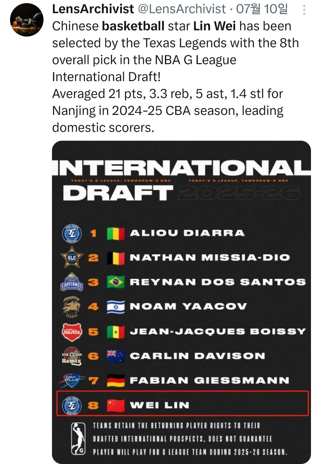 < NBA G LEAGUE 진출한 린 웨이 >
