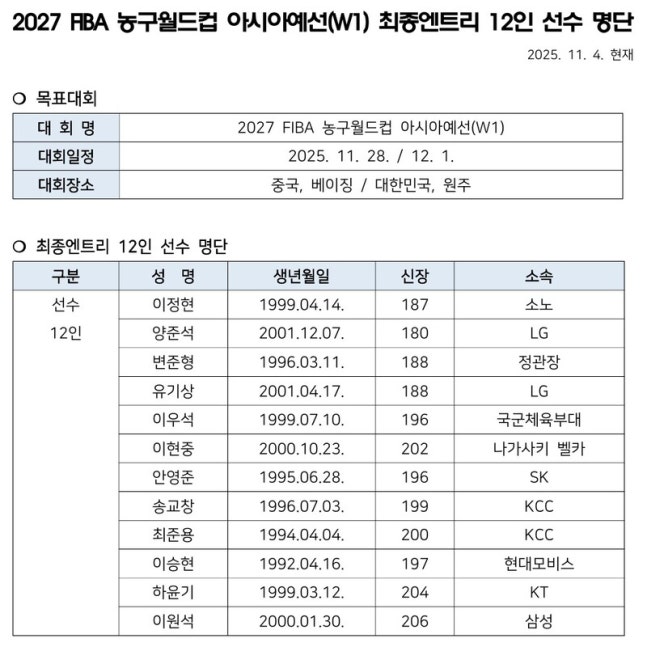 [공식발표] 대한민국농구협회, 2027 FIBA 농구 월드컵 아시아예선(W1) 대비 최종 12인 선발(예비명단도 첨부)