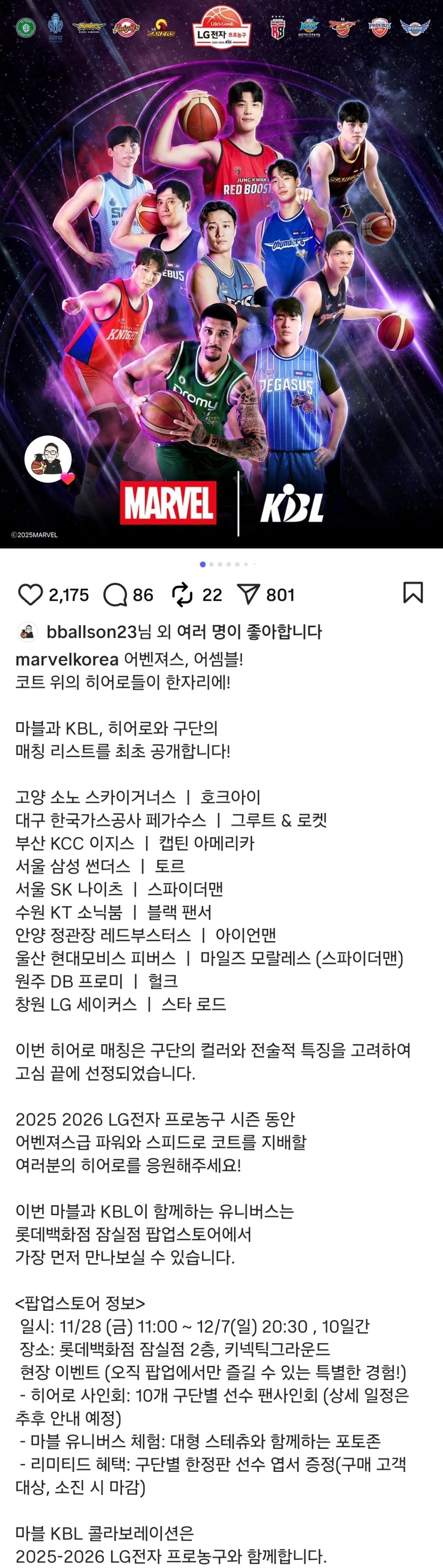 작성자sheed 작성시간 25.11.20 KCC는 이지스가 방패니 캡틴아메리카(방패)로 한것같고.. 스카이거너스가 차라리 스타로드하고 세이커스는 팔콘 또는 호크아이하는게 더 잘맞았을수도있을듯 ㅋㅋ