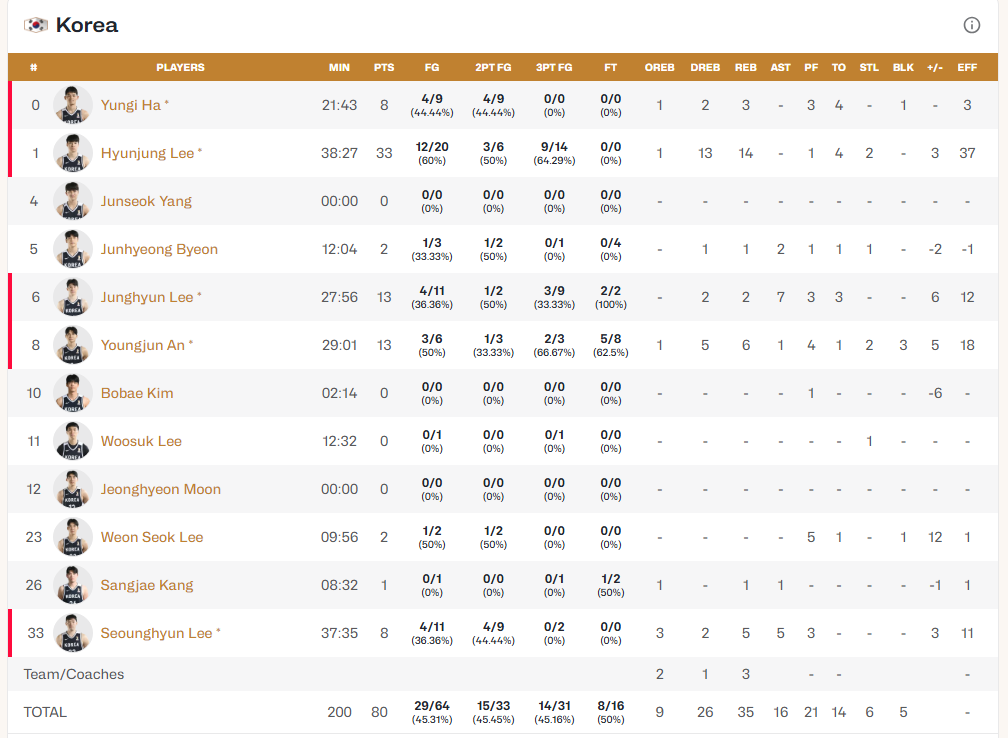 대한민국 vs 중국 박스스코어 작성자Melo|작성시간25.11.28|조회수3,658 목록 댓글 17 글자크기 작게가 글자크기 크게가 33득점 14리바운드 2스틸 3점 9/14 대현중!! 다음검색 현재 게시글 추가 기능 열기 북마크 공유하기 신고 센터로 신고 댓글 댓글 17 댓글쓰기 답글쓰기 댓글 리스트 답댓글 작성자이사장 | 작성시간 25.11.29 워니고 안되니 현중고 ㅋㅋㅋㅋ 작성자76다마 | 작성시간 25.11.29 이길 각이 안보인다고 했는데, 이현중이 제 생각을 때려부셨네요. 작성자이인권 | 작성시간 25.11.29 와 현중리!!! 작성자딩요돌이 | 작성시간 25.11.29 효율과볼륨 견고함 모두갖춘남자! 작성자카카1 | 작성시간 25.11.29 기록 잘 보았습니다. 댓글 전체보기