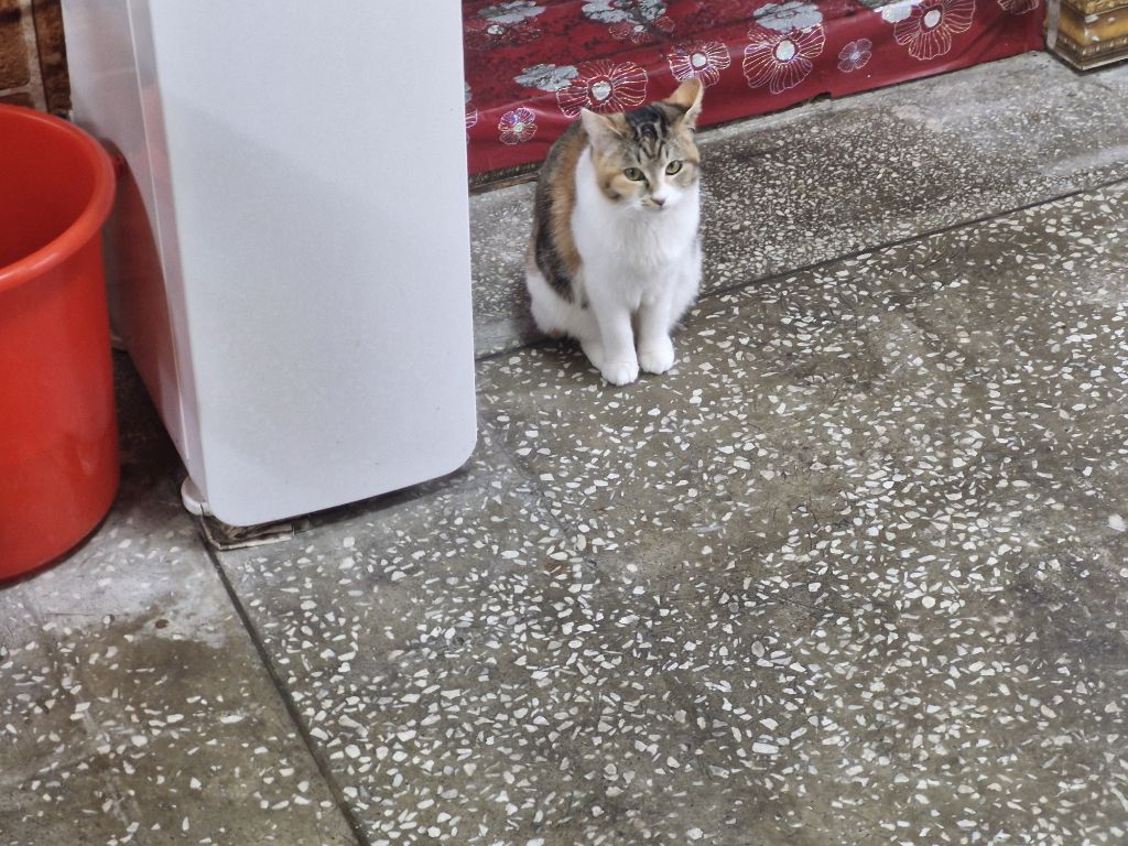 식당 안의 고양이가 얌전히 앉아있었다.