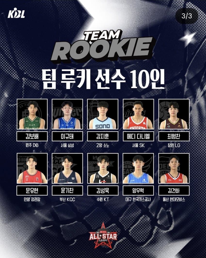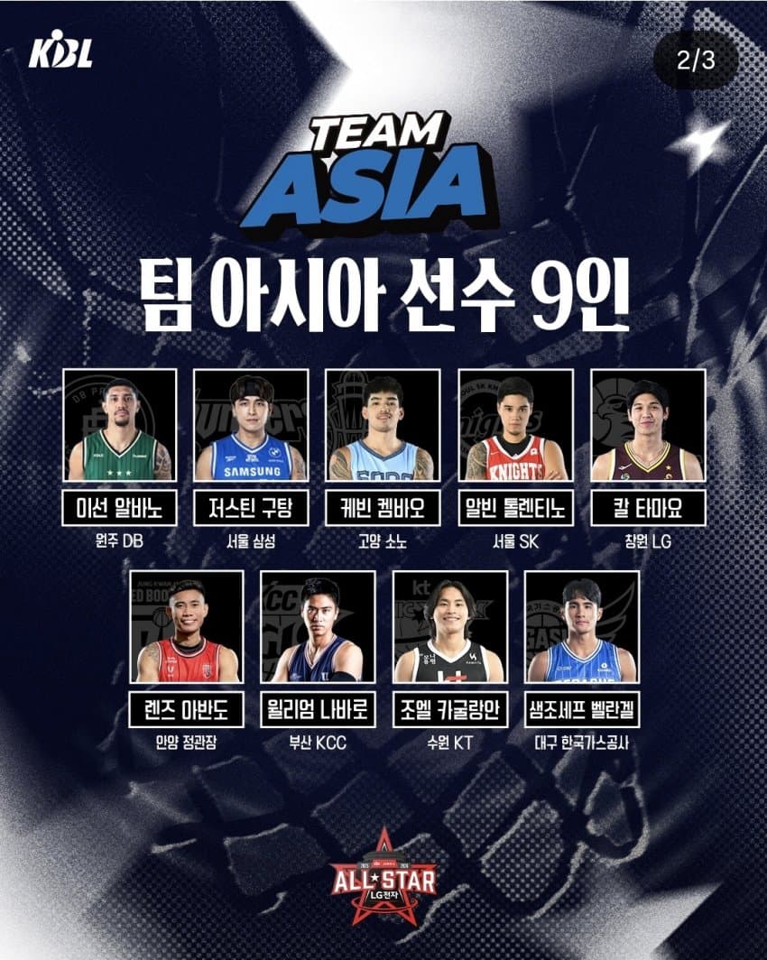 팀 아시아는 현재 KBL에서 뛰어난 기량을 선보이고 있는 이선 알바노(DB), 케빈 켐바오(소노), 칼 타마요(LG) 등 총 9명의 아시아쿼터 선수로 구성됐다. 팀 루키에는 에디 다니엘(SK), 강성욱(KT), 양우혁(한국가스공사), 김건하(현대모비스) 등 총 8명의 올 시즌 신인선수를 포함해 총 10명의 선수가 선발됐다.