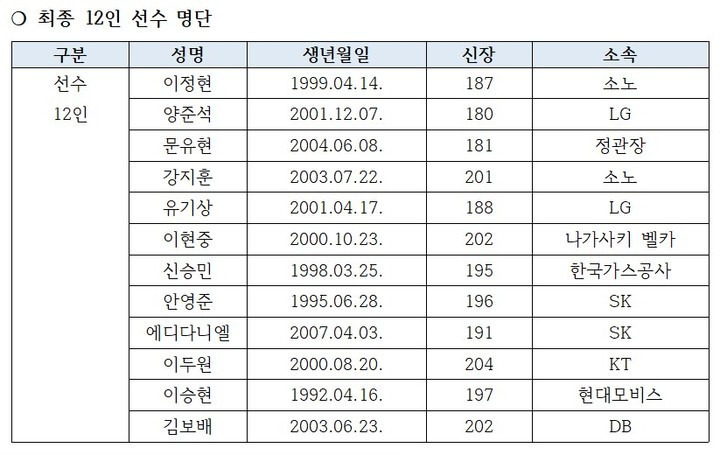 남자농구 대표팀 12인 선수 명단 변동 작성자Jason-Kidd|작성시간26.02.21|조회수3,039 목록 댓글 7 글자크기 작게가 글자크기 크게가 송교창 부상 => 안영준 대체발탁 이원석 부상 => 이두원 대체발탁 다음검색 현재 게시글 추가 기능 열기 북마크 공유하기 신고 센터로 신고 댓글 댓글 7 댓글쓰기 답글쓰기 댓글 리스트 작성자이사장 | 작성시간 26.02.21 그래도 주전 평균신장은 많이 올라왔네요 작성자돌아온 찰리박 | 작성시간 26.02.21 용병센타만 있어도 좀 더 편안할텐데... 작성자카카1 | 작성시간 26.02.22 정보 잘 보았습니다 작성자짐더간2 | 작성시간 26.02.22 오히려 좋은듯요 작성자ATLHWAK | 작성시간 26.02.23 솔직히 두원이가 원석이보다 나아보이는. 댓글 전체보기