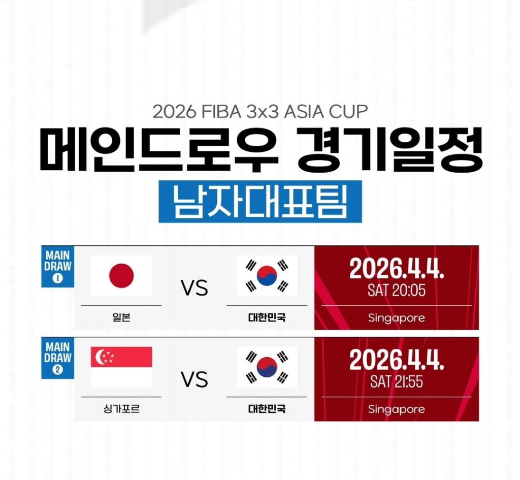 [3x3 아시아컵] 메인드로 한국팀 대진표 작성자King james|작성시간26.04.04|조회수593 목록 댓글 4 글자크기 작게가 글자크기 크게가 오늘 밤8시10시 네요대한민국 파이팅8강 가보자https://www.youtube.com/live/Dfz-ygBWEUc?si=vRZ97u4WnWdFQiq1LIVE 🔴 FIBA 3x3 Asia Cup 2026 | Day 4 - Group Phase | Session 1 | #3x3BasketballThe road to the FIBA 3x3 Asia Cup 2026 starts NOW! 🏆 Join us #live from Singapore for Day 4/Session 1 of the Group Phase. See which teams will rise to the c...www.youtube.com중계는유튜브 채널 라이브로 다음검색 현재 게시글 추가 기능 열기 북마크 공유하기 신고 센터로 신고 댓글 댓글 4 댓글쓰기 답글쓰기 댓글 리스트 작성자풀코트프레스 | 작성시간 26.04.04 그까이꺼 빡세게 이겨버렷! 작성자이사장 | 작성시간 26.04.04 오 한일전이네요! 답댓글 작성자King james 작성자 본인 여부 작성자 | 작성시간 26.04.04 이겼네요 ㄷㄷ한국 강합니다 작성자King james 작성자 본인 여부 작성자 | 작성시간 26.04.04 일본전 승리 ㄷㄷ 댓글 전체보기