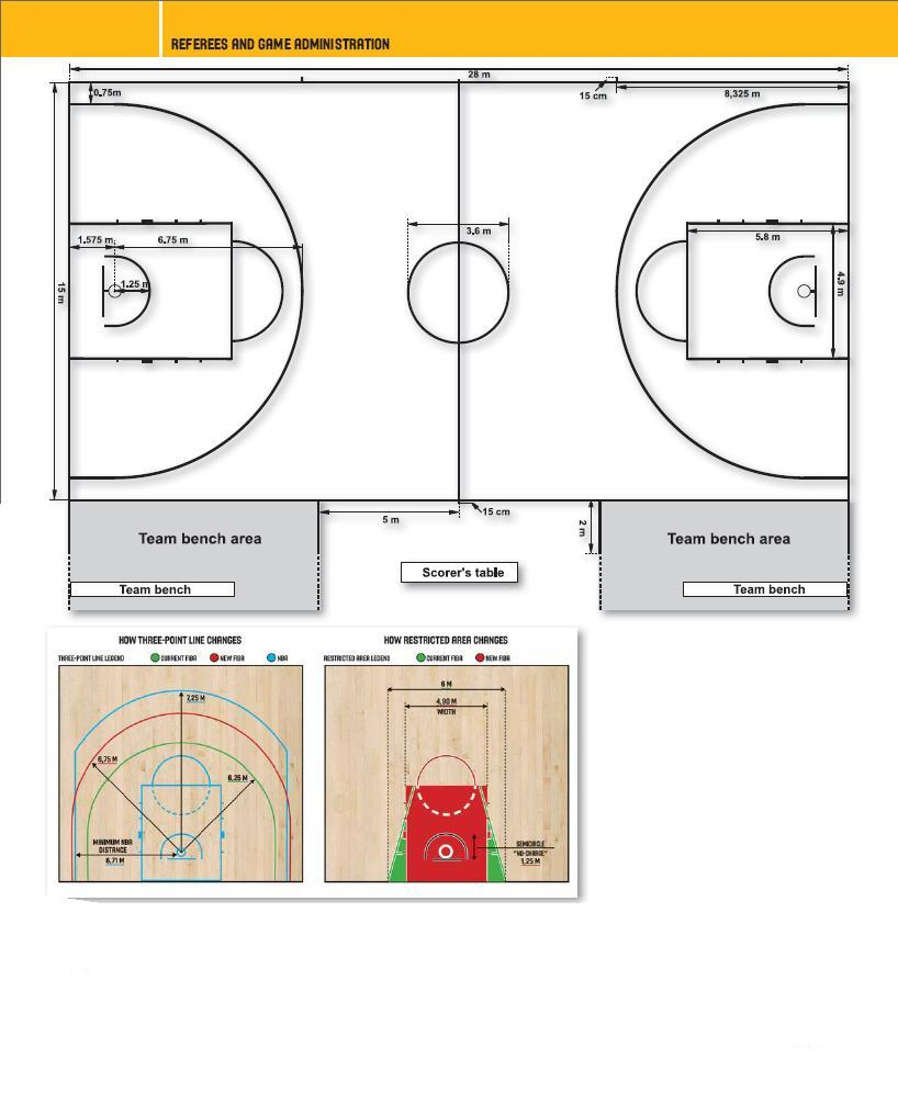 - 코트는 NBA식으로 사다리꼴에서 직사각형 모양으로 변경되며, 골밑 부근 반원을 그린 지역에서는 노차칭 지역으로
