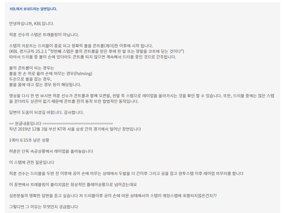 결론은 허훈 선수의 스텝은 트레블링이 아니라고 합니다