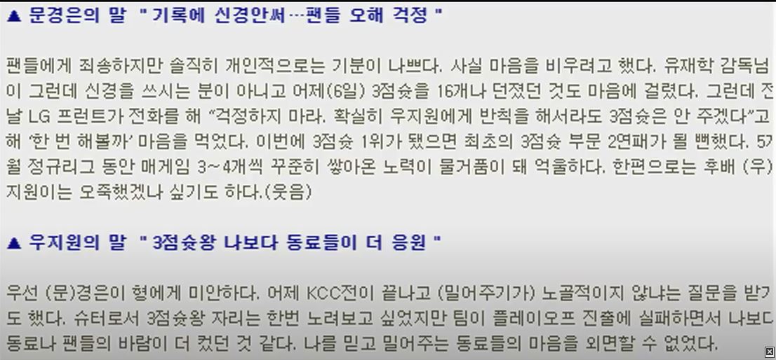 문경은이 3점 쏘는데 손도 안 들고 블락을 전혀 하지 않는 수비.. 삼보는 왜 문경은을 밀어주지?