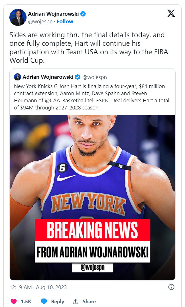 하트와 4년 81M의 연장 계약을 체결했다고 보도했습니다.