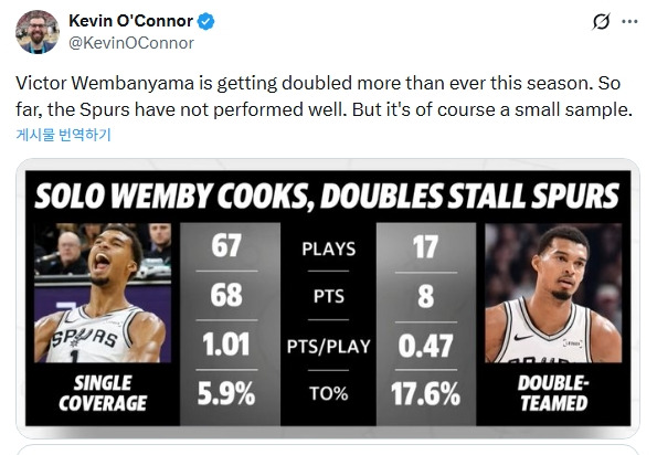 X에서 Kevin O'Connor 님 : "Victor Wembanyama is getting doubled more than ever this season. So far, the Spurs have not performed well. But it's of course a small sample. https://t.co/V40aKOKvFB" / X