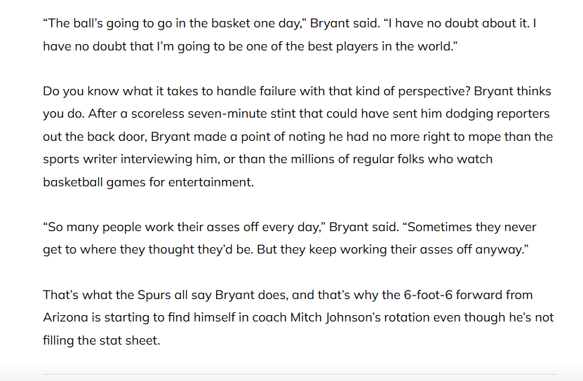 그런 관점으로 실패를 받아들이는 데 필요한 것이 무엇인지 아시나요? 브라이언트는 여러분이 알고 있다고 생각하는 것 같습니다. 7분 동안 득점 없이 코트를 떠난 후, 기자들을 피해 뒷문으로 도망치고 싶을 만큼 화가 났던 브라이언트는 자신을 인터뷰하는 스포츠 기자나 농구 경기를 즐기는 수많은 일반 팬들처럼 자신도 한탄할 자격이 없다고 강조했다.