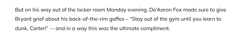 스퍼스 선수들은 모두 브라이언트가 바로 그런 사람이라고 말합니다. 그리고 바로 그 때문에 애리조나 출신의 198cm 포워드인 브라이언트는 스탯 기록지에는 눈에 띄는 활약을 보여주지 못하더라도 미치 존슨 감독의 로테이션에 점점 더 많이 포함되고 있는 것입니다.