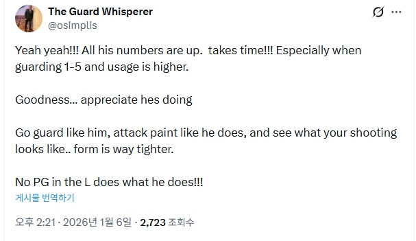 최근 경기들에서 쉬워보이는 덩크도 놓치고 아직 설익은 느낌이 많이 나는 플레이를 하고 있지만 좋은 피지컬을 지녔고 열심히 노력중인만큼 3년차쯤에는 한자리를 차지하지 않을까 기대해 봅니다.