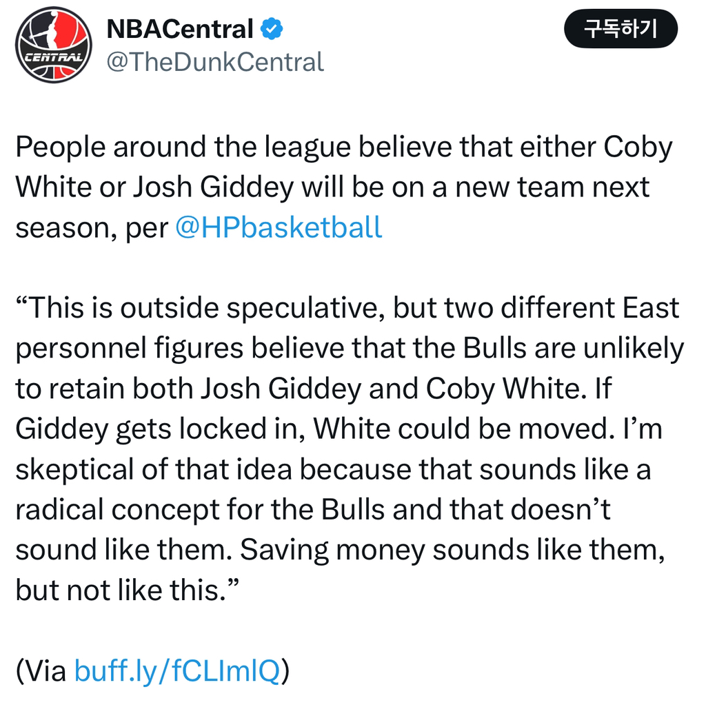 리그 관계자들은 코비 화이트 혹은 조쉬 기디 둘중 한명은 차기 시즌 다른 팀에서 뛸것이라고 믿고 있음 (Moore) 작성자(CHI)불타는개고기|작성시간25.06.04|조회수97 목록 댓글 0 글자크기 작게가 글자크기 크게가 https://x.com/thedunkcentral/status/1929916550712000636?s=46&t=ZnclgswjWbGLdrsx0Y9Zvg음…… 🤔 다음검색 현재 게시글 추가 기능 열기 북마크 신고 센터로 신고 댓글 댓글 0 댓글쓰기 답글쓰기 댓글 리스트