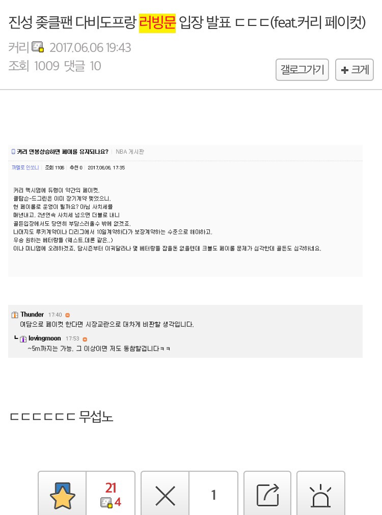 # 저 두 개의 글 작성자인 DC nba 갤러리의 "커리"님이 혹시라도 알럽회원이시면 비댓 좀 주세요. 이야기해보고 싶네요 ㅋㅋ