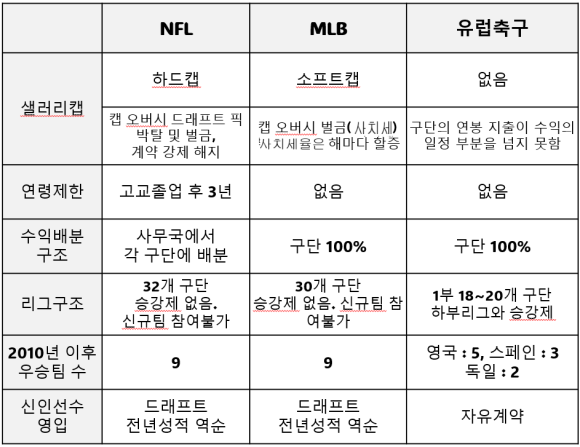 NFL은 MLB과 리그의 운영시스템에서 많이 다릅니다. 유럽의 축구리그와는 극단적으로 차이가 있다. 셋을 비교해 봅시다