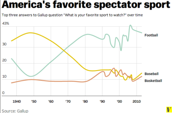 위 표는 갤럽이 정기적으로 미국인들에게 가장 좋아하는 스포츠를 묻는 질문에 대한 대답의 변화를 시대별로 정리한 것입니다. 1960년초 초반까지는 야구가 압도적 1위였습니다. 메이저리그는 1869년 신시내티 레드스타킹가첫 프로팀을 창설하고 1900년 첫 월드시리즈가 시작한 이후로 미국을 대표하는 스포츠 리그였습니다.