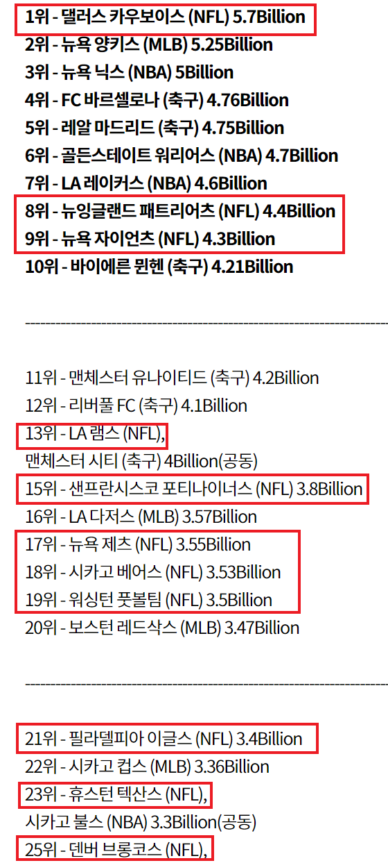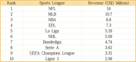 단일 국가의 단일 스포츠로써 가장 많은 돈을 버는 종목은 미국의 프로미식축구 리그인 NFL입니다. 물론 5대리그라는 영국과 스페인, 독일,이탈리아,프랑스 축구와 유럽챔피언쉽리그를 합치면 308.4억 달러로 NFL의 160 달러를 압도합니다. 이는 세계 스포츠로서 타국가에서 발생하는 이익이 워낙 많아서 이기도 하고 유럽에 축구에 비견 될만한 프로스포츠가 존재하지 않는다는 점도 영향을 미칩니다. 미국의 경우 NFL뿐만 아니라 야구 메이저리그와 농구 NBA도 엄청나게 큰 시장을 형성하고 있습니다.