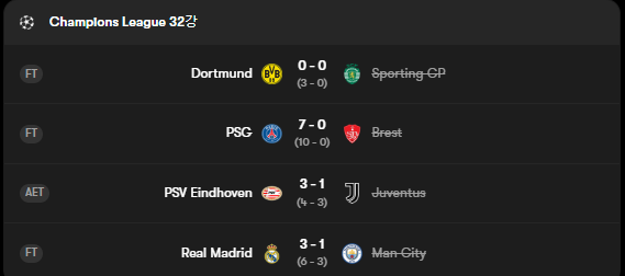 도르트문트 / PSG / 아인트호벤 / 레알 마드리드 16강 진출