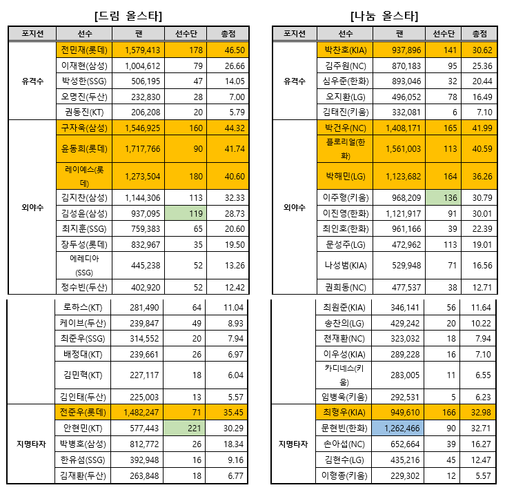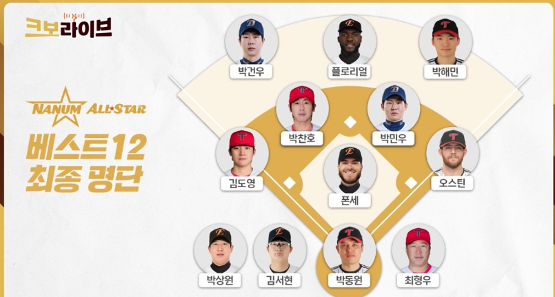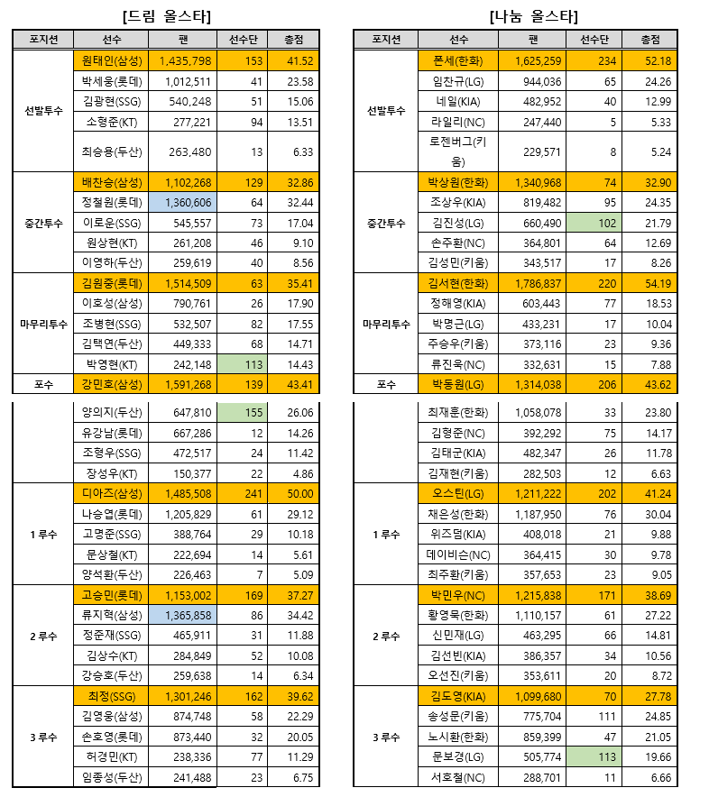 KBO 올스타전 베스트12 최종 명단 작성자Melo|작성시간25.06.23|조회수1,378 목록 댓글 10 글자크기 작게가 글자크기 크게가 다음검색 현재 게시글 추가 기능 열기 북마크 공유하기 신고 센터로 신고 댓글 댓글 10 댓글쓰기 답글쓰기 댓글 리스트 작성자LEBRON JAMES | 작성시간 25.06.23 정철원 같은 애들이 잼있는데 떨어졌네요 ㅋ 작성자소프트크림 | 작성시간 25.06.23 안현민은 감독추천이라도 무조건 갈듯 작성자[NSNL]Delta Center | 작성시간 25.06.23 역시 클래식 두 팀이 드림 접수했네요 ㄷㄷ 작성자HEATShaq32 | 작성시간 25.06.23 롯데!!!! 작성자돌아온 찰리박 | 작성시간 25.06.23 현빈이 아쉽네요 댓글 전체보기