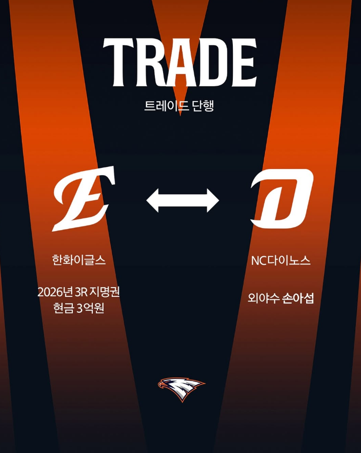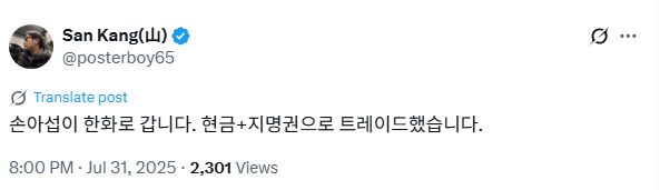 '현역 타율 3위' 손아섭, 전격 한화행…트레이드 마감일 지명권 극적 합의 작성자Melo|작성시간25.07.31|조회수2,424 목록 댓글 37 글자크기 작게가 글자크기 크게가 손아섭 <--> 3라 지명권, 3억 https://m.sports.naver.com/kbaseball/article/076/0004306586[단독] '현역 타율 3위' 손아섭, 전격 한화행…트레이드 마감일 지명권 극적 합의[단독] '현역 타율 3위' 손아섭, 전격 한화행…트레이드 마감일 지명권 극적 합의 입력2025.07.31. 오후 7:55 기사원문 공감 좋아요0슬퍼요0화나요0팬이에요0후속기사 원해요0 텍스트 음성 변환 서비m.sports.naver.com 다음검색 현재 게시글 추가 기능 열기 북마크 공유하기 신고 센터로 신고 댓글 댓글 37 댓글쓰기 답글쓰기 댓글 리스트 작성자타이론 LUE | 작성시간 25.07.31 시환이 아습 오빠 앞에서 맨날 춤추겠네요 ㅋㅋㅋㅋ 작성자Jason-Kidd | 작성시간 25.07.31 손아섭 잘했음 좋겠네요. 한화 응원합니다. 작성자No.1 & no.41 | 작성시간 25.08.01 자금력이 예전 같지 않겠죠. 내년에 FA로 못 잡으니 지명권이라도 챙긴 듯 합니다. 작성자이인권 | 작성시간 25.08.01 이거슨 무슨일이고~~ㅎㅎㅎㅎㅎㅎㅎㅎ 작성자Reichwooks | 작성시간 25.08.01 손아섭 우승해보는건가 댓글 전체보기