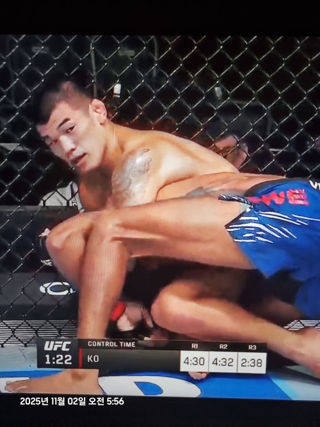 KO는 자기만의 스타일 있다! 지치지않고 끈질긴 스타일이다 (grinder style). KO 경기는 처음 중계하지만, 탑에서 해비한게 정말 인상에 깊다. 특히 오버훅! 대부분 오버훅을 안주려고 하지만, 오버훅으로 레슬링 컨트롤을 하고 있다. 그리고 그라운드에서 홀딩만 하려고하는게 아니라 계속해서 멈추지않고 공격하고 있다. 정말 지치지 않는다.