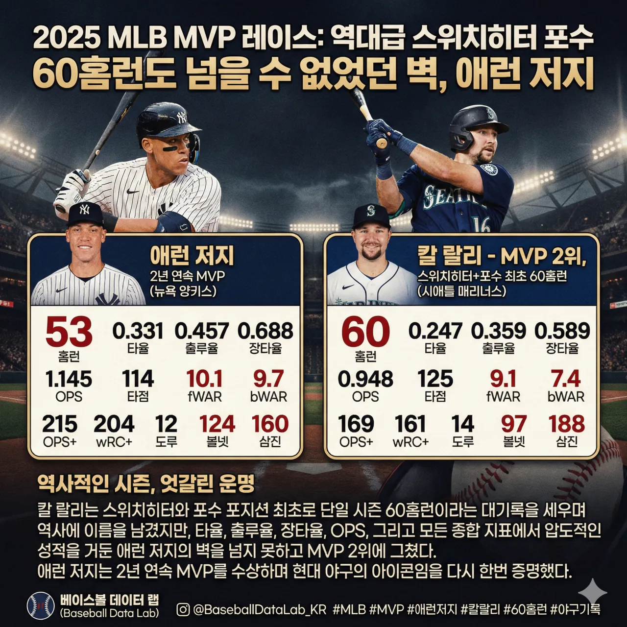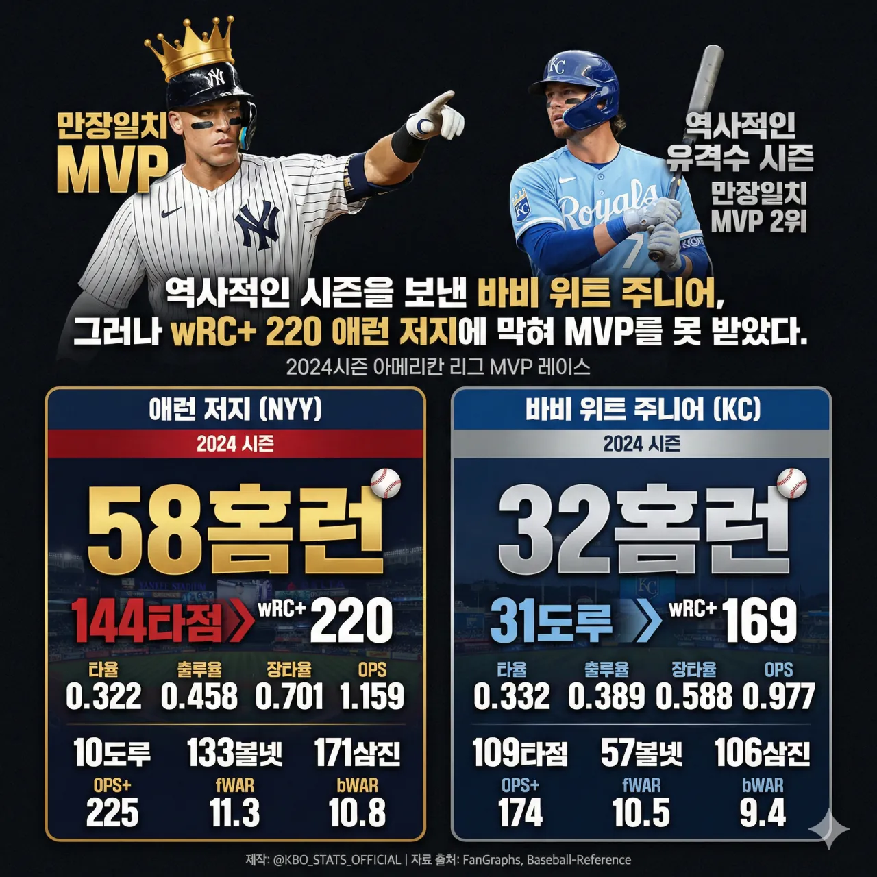 답댓글 작성자욕쟁이아가 작성시간 26.01.11 스탯은 대부분 저지 우위였는데 저지의 후반기 부진이 영향을 줬던 걸로 기억합니다.