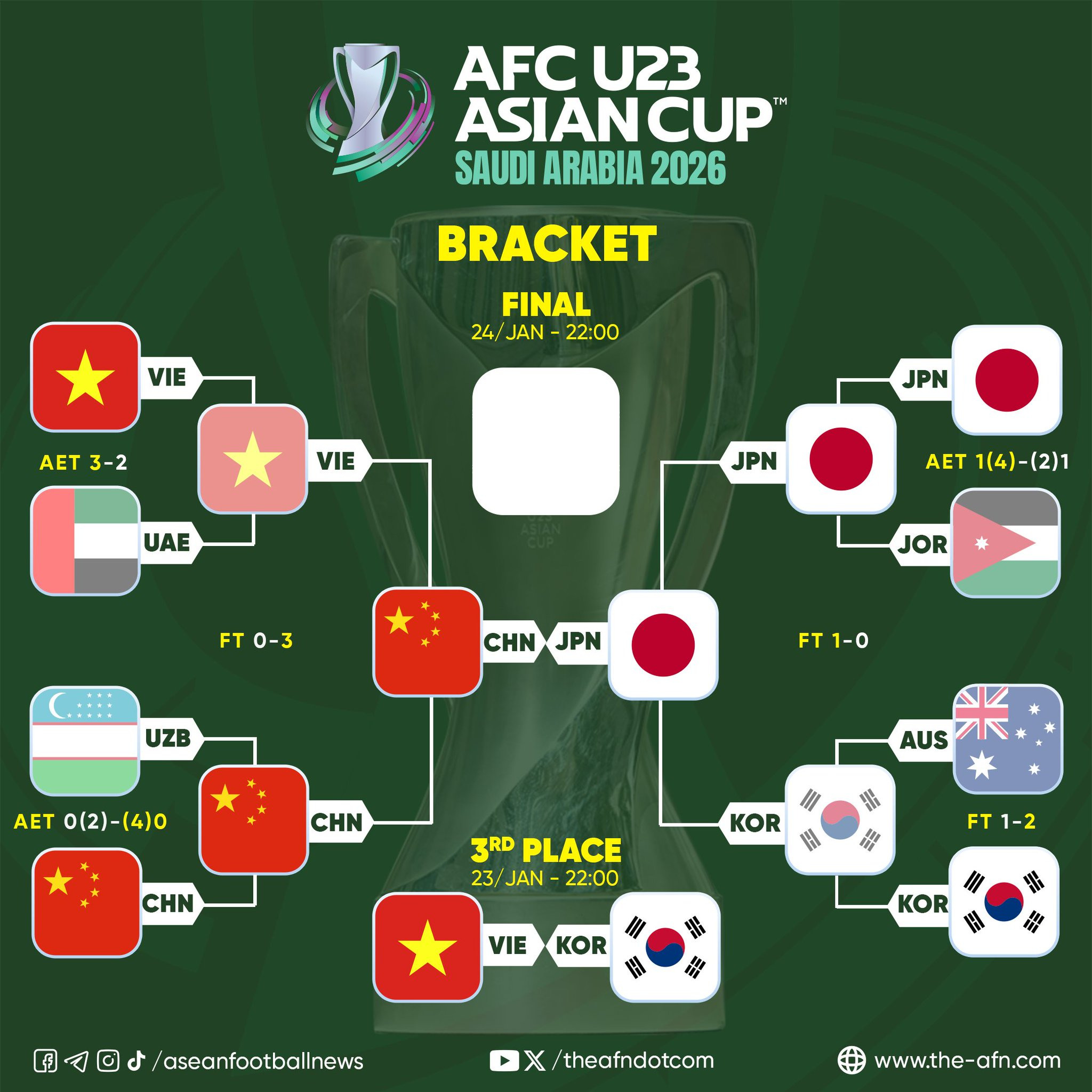 [스크랩] 2026 AFC U-23아시안컵 결승전 & 3.4위전 대진표 작성자Jason-Kidd|작성시간26.01.21|조회수2,093 목록 댓글 5 글자크기 작게가 글자크기 크게가 결승전중국 vs 일본1월 25일(일) 밤 12:003.4위전베트남 vs 대한민국1월 24일(토) 밤 12:00 다음검색 스크랩 원문 : 이종격투기 현재 게시글 추가 기능 열기 북마크 공유하기 신고 센터로 신고 댓글 댓글 5 댓글쓰기 답글쓰기 댓글 리스트 작성자풀코트프레스 | 작성시간 26.01.21 식사마 부탁해요 작성자#8spree | 작성시간 26.01.21 3-4위전 하는 이유를 모르겟음~ 올림픽이나 아시안게임은 메달이라도 잇는데~ 작성자K_Bryant8 | 작성시간 26.01.21 중국이 결승이라니.. 중국 축구가 성장을 하는건가 작성자미카엘 요르단 | 작성시간 26.01.21 4강이명 체면은 차렸네요 작성자mimin | 작성시간 26.01.24 한국 시간 밤 12시가 아니라 새벽 4시였군요. 댓글 전체보기