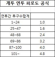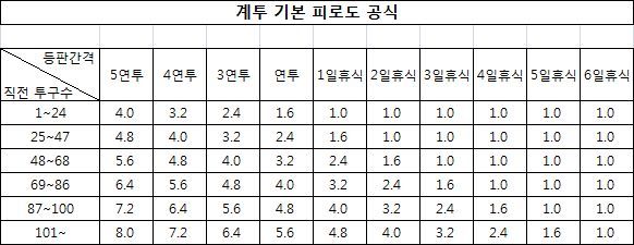 계투 공식은 (투구수*기본식 값)+(투구수*연투식 값[연투가 있을 경우에만])+(경기수*20)이고