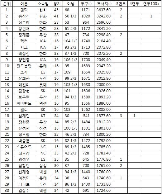 답댓글 작성자깊은슬픔 작성자 본인 여부 작성자 작성시간 16.07.05 마지막으로 제가 투구수를 선발, 불펜으로 나누고 연투에 대한 가중치를 넣으면서 임의로 변경해서 사용 중입니다.