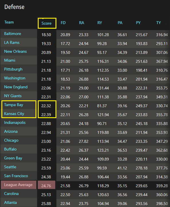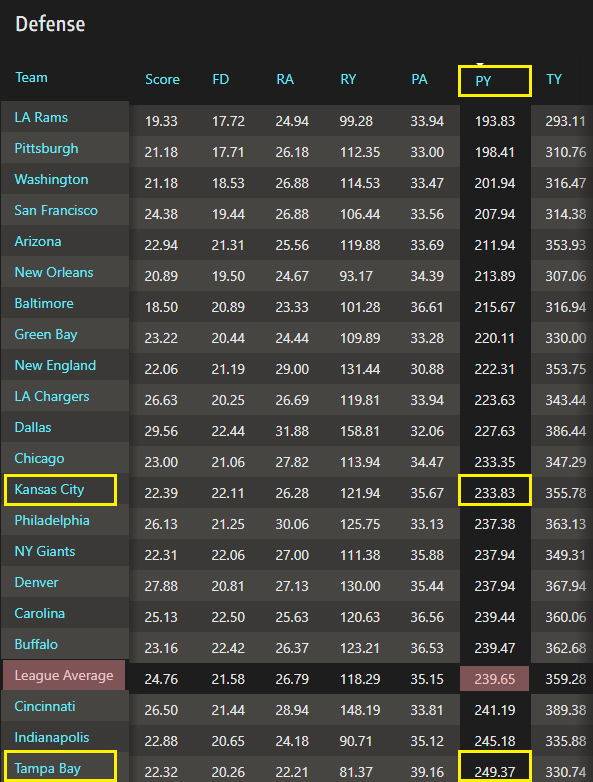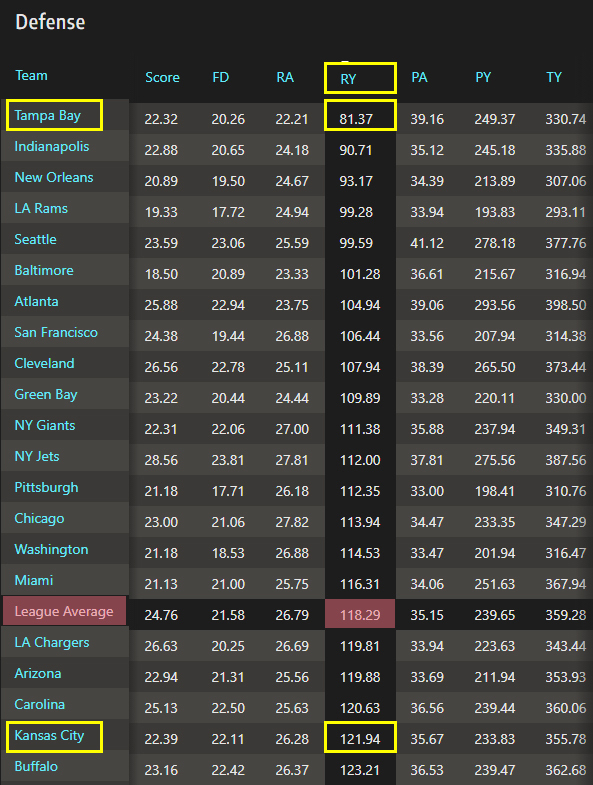 러싱 시도 당 허용 야드는 4.5 ypc(yards per carry)로