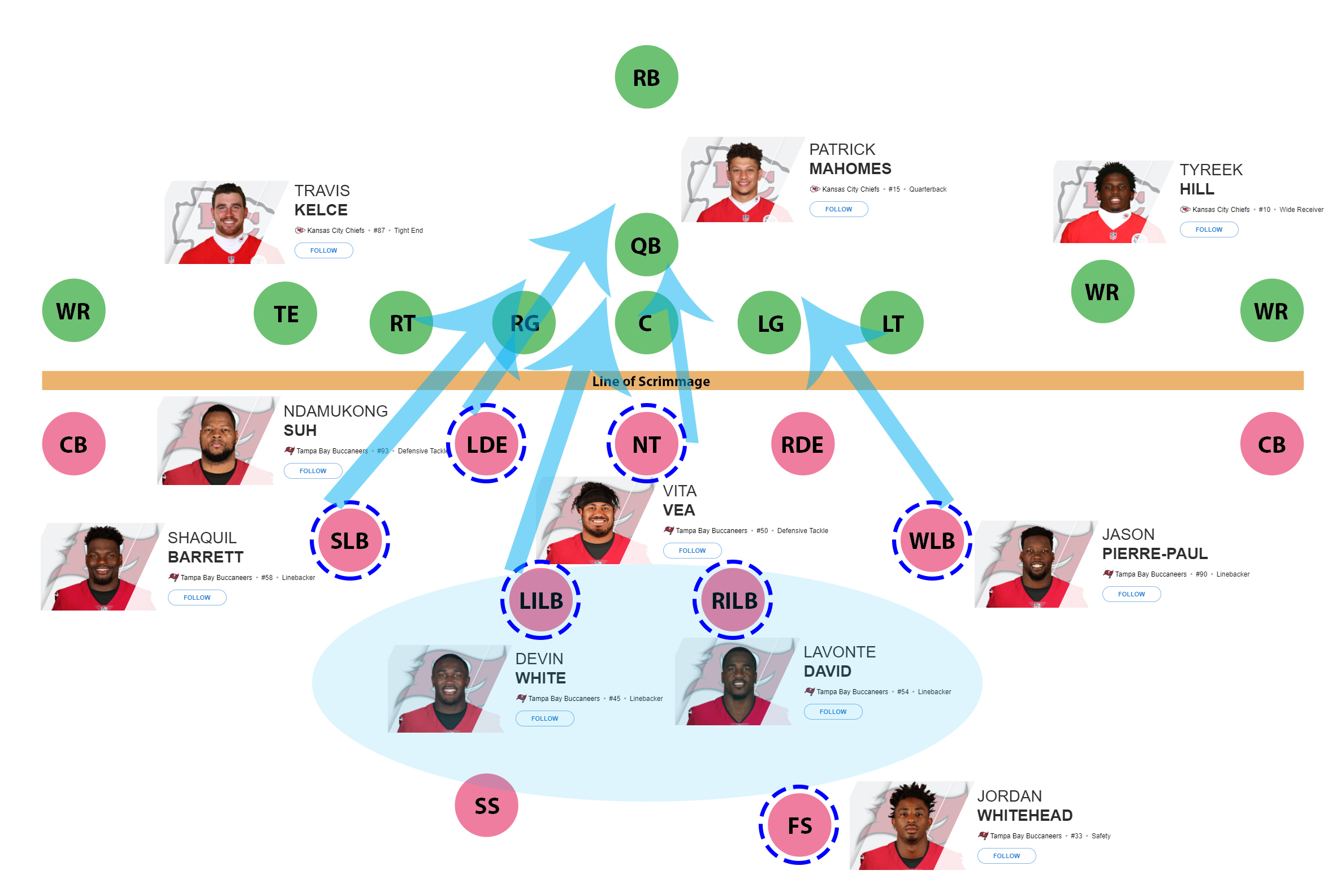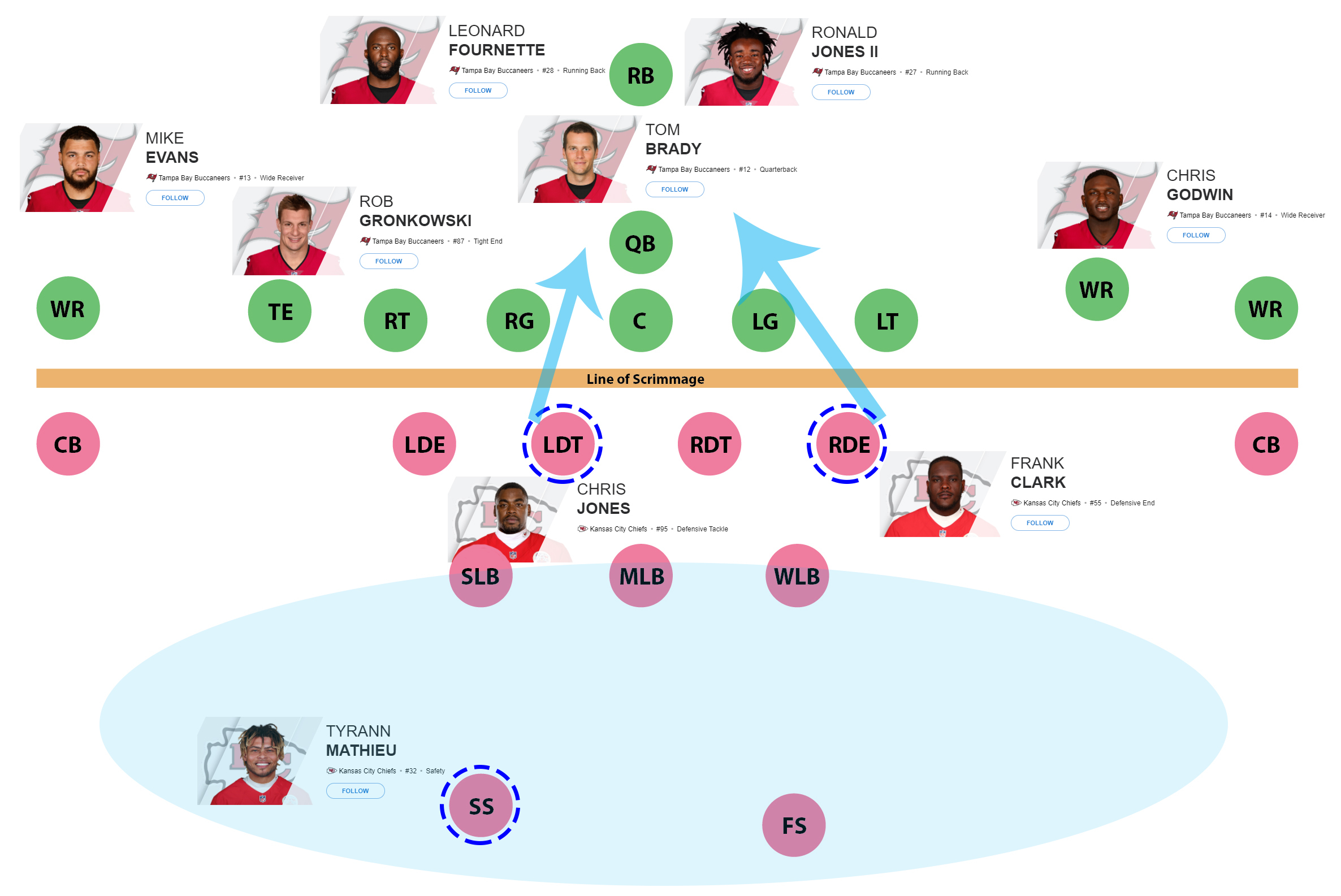O-line의 프로텍션을 뚫고 브래디(QB)를 압박하면,